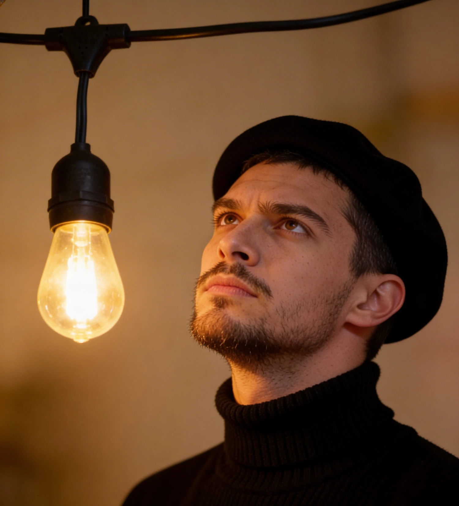 A man in a black beret and turtleneck gazes at a glowing light bulb, creating a warm and thoughtful atmosphere.