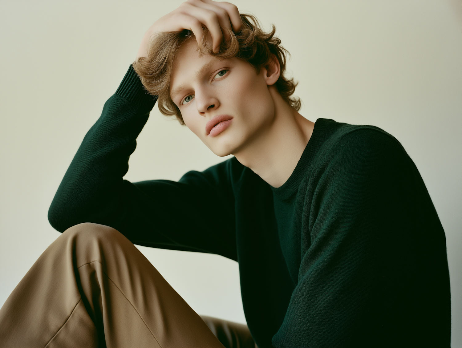 Young man with light brown hair and blue eyes in a dark green sweater, sitting contemplatively against a neutral background.