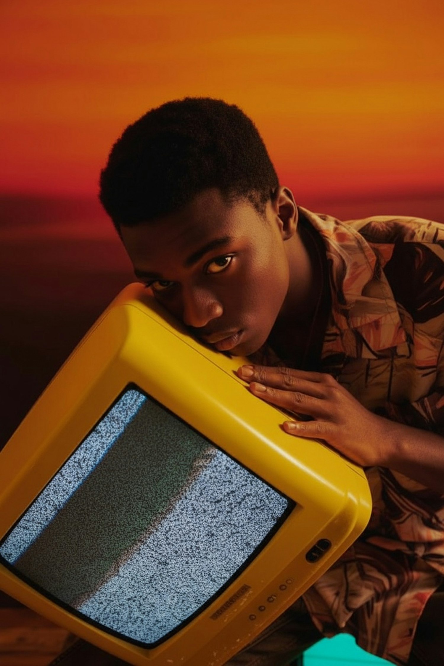 A young man leans on a yellow vintage TV with static, set against a vibrant orange background, creating a bold and artistic scene.