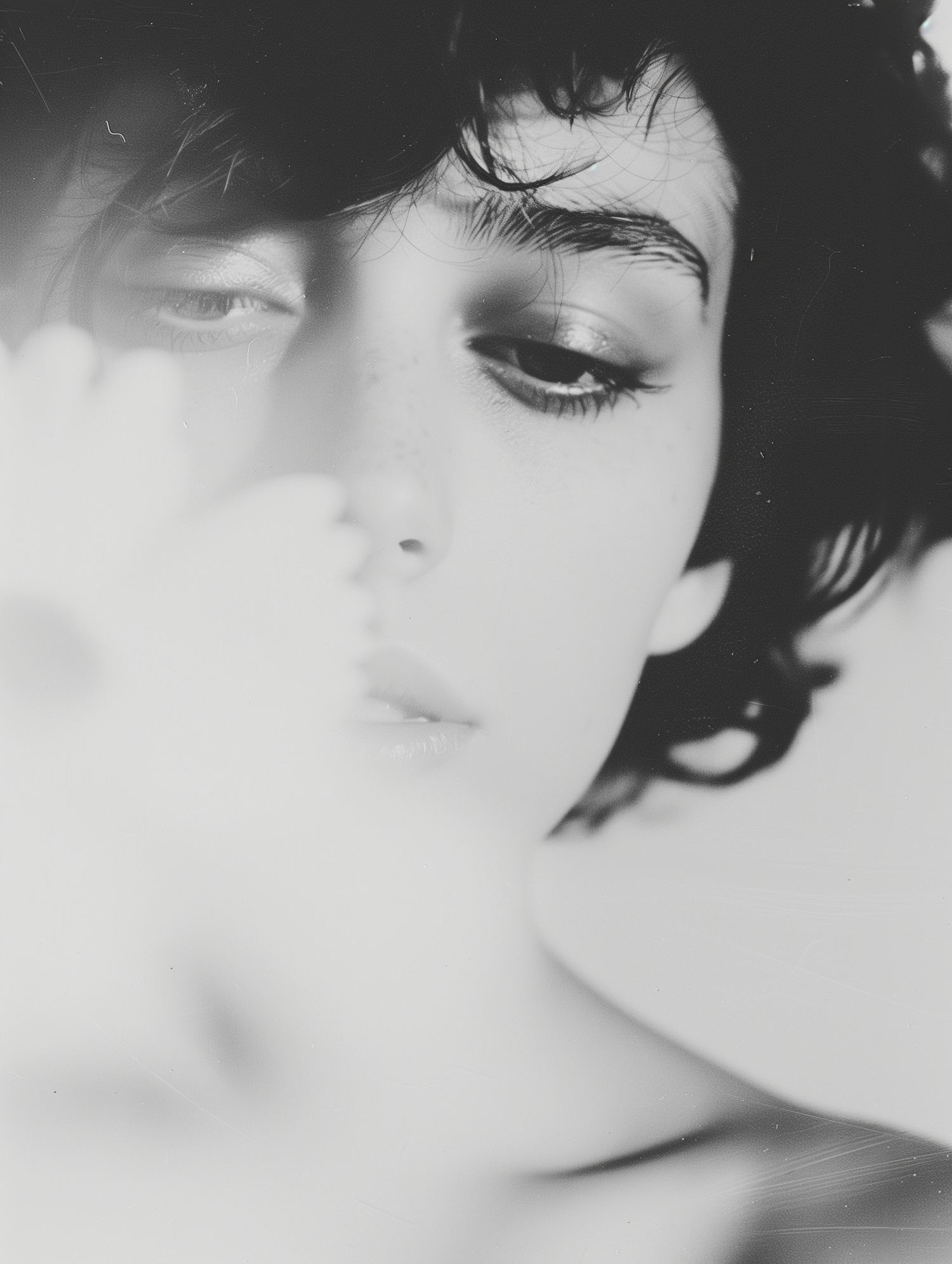 Black and white portrait of a young person with short curly hair, gazing downward, partially obscured by a white flower.