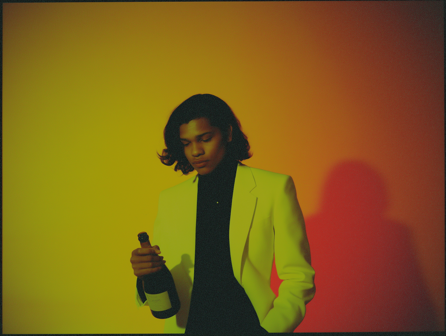 Stylish individual in a white blazer holding a bottle, set against a vibrant yellow-to-red gradient background.