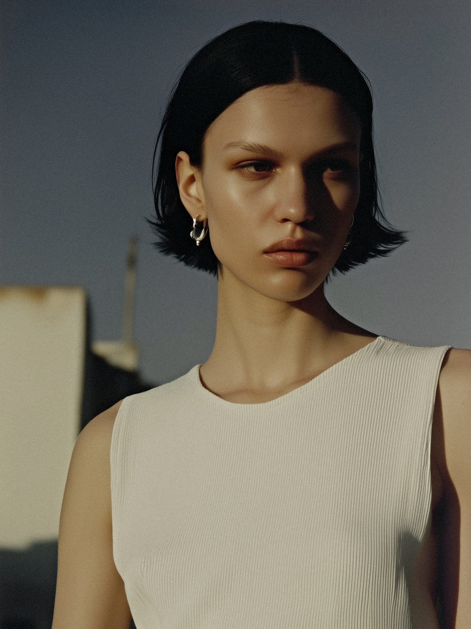 A person with short black hair and a white sleeveless top stands outdoors, illuminated by warm light, with a blurred gradient sky in the background.