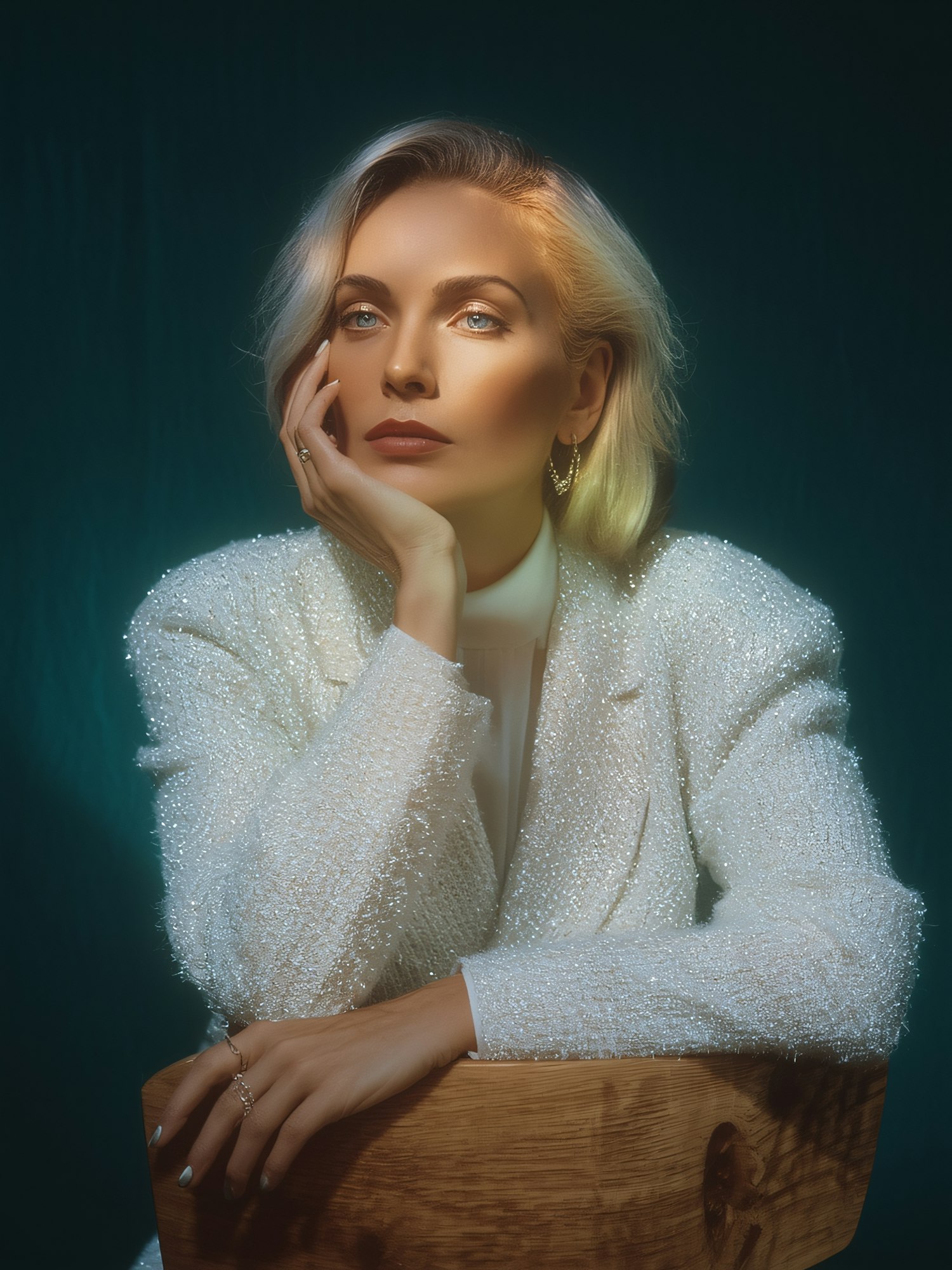 A blonde woman in a textured white blazer poses thoughtfully against a teal background, resting on a wooden surface.