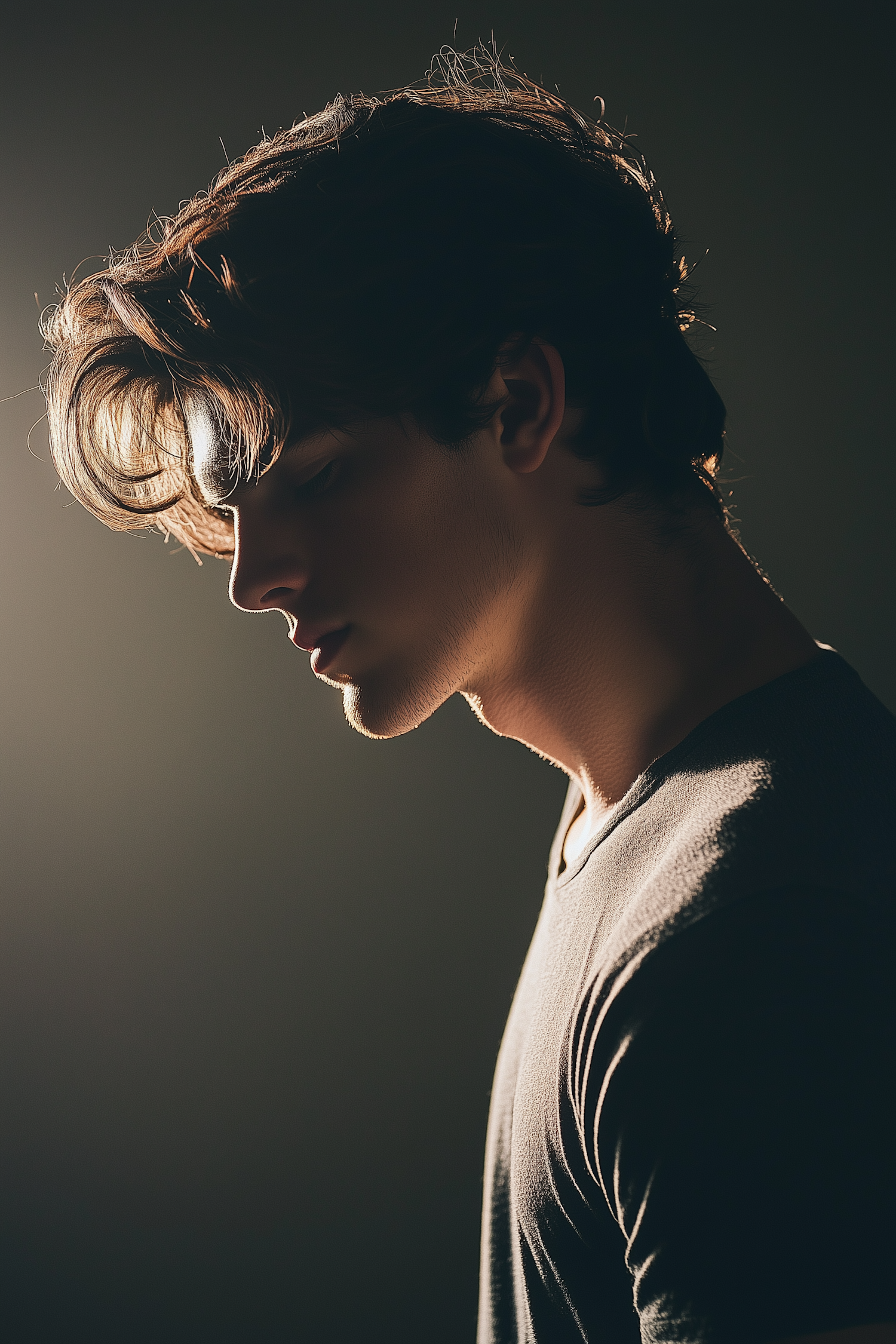 Dramatic side profile of a young man with wavy brown hair, illuminated by warm backlighting against a dark background.