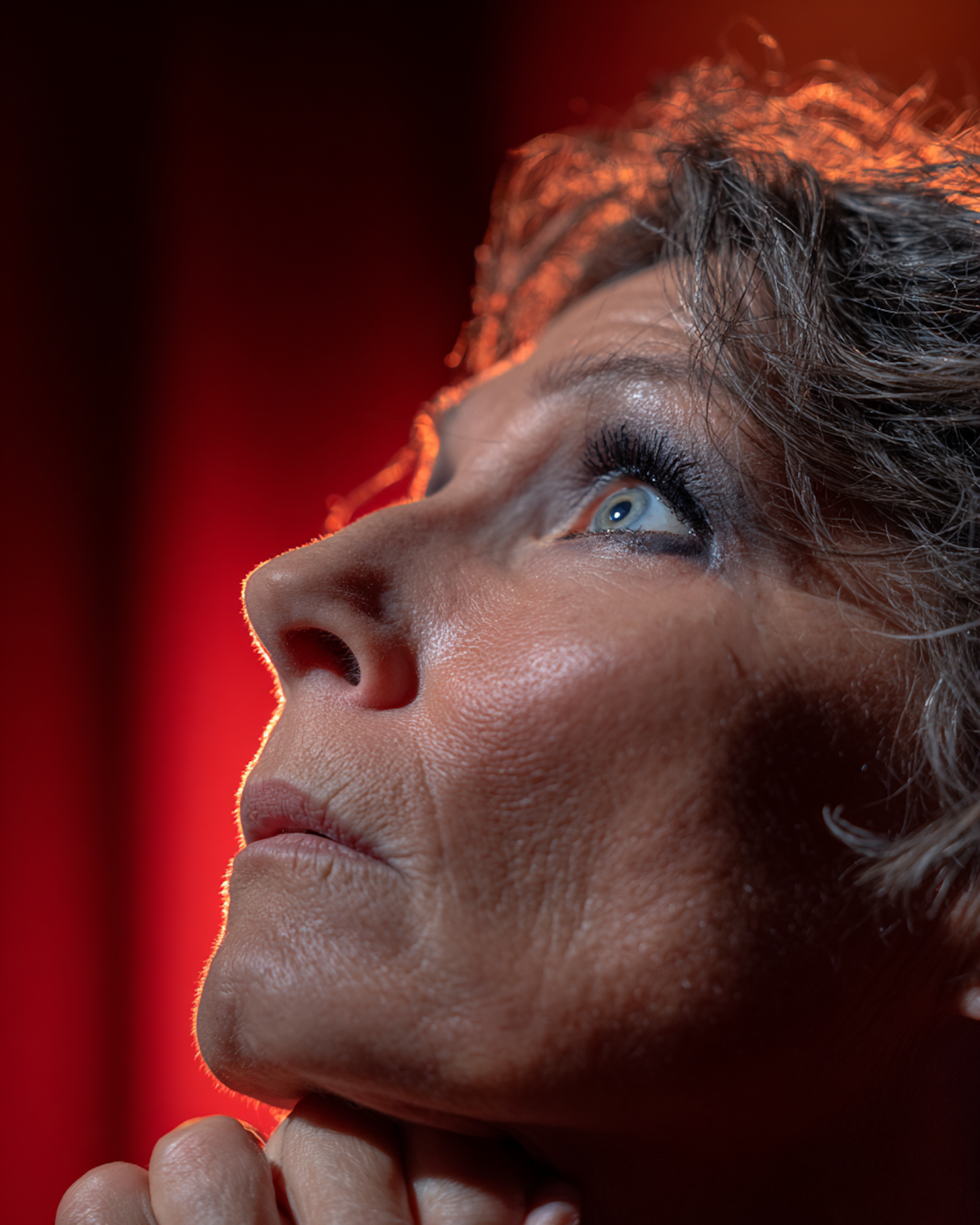 Close-up of a person gazing upward with dramatic lighting and a red background, emphasizing their expression and natural features.