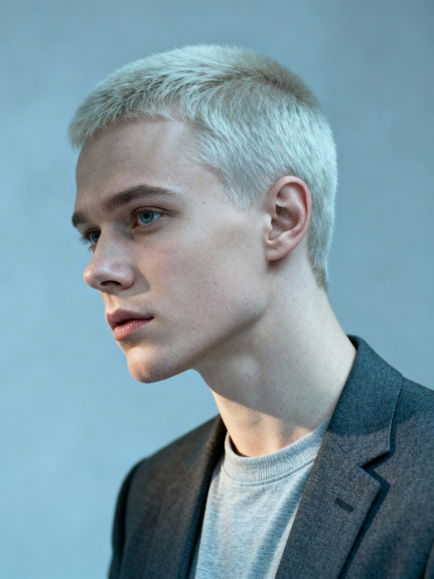 A young man with platinum blonde hair and a gray blazer gazes thoughtfully, set against a soft, neutral background.