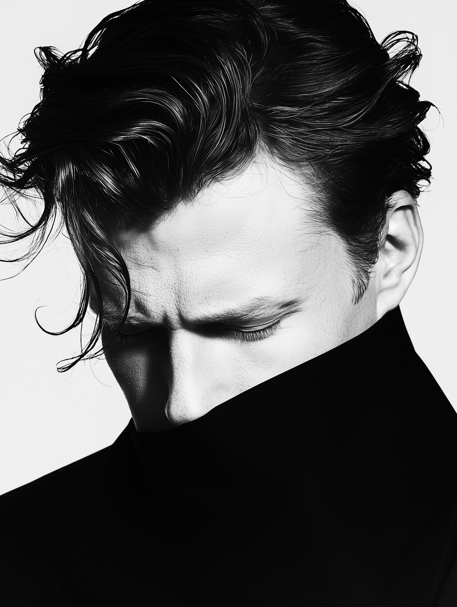 Black and white portrait of a man with wavy hair, eyes closed, wearing a high-collared garment. Dramatic and mysterious vibe.