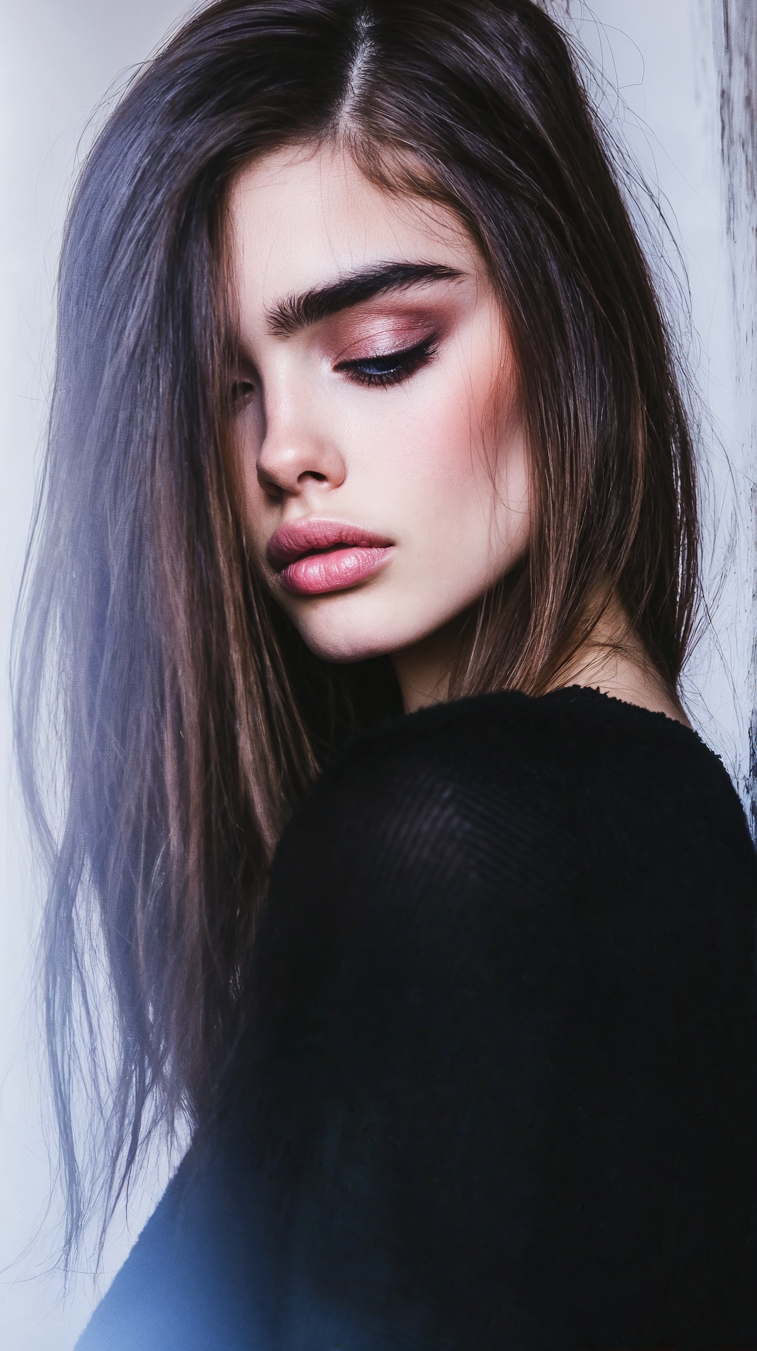 Close-up of a young woman with long brown hair, thick eyebrows, and soft makeup, wearing a black top against a blurred background.