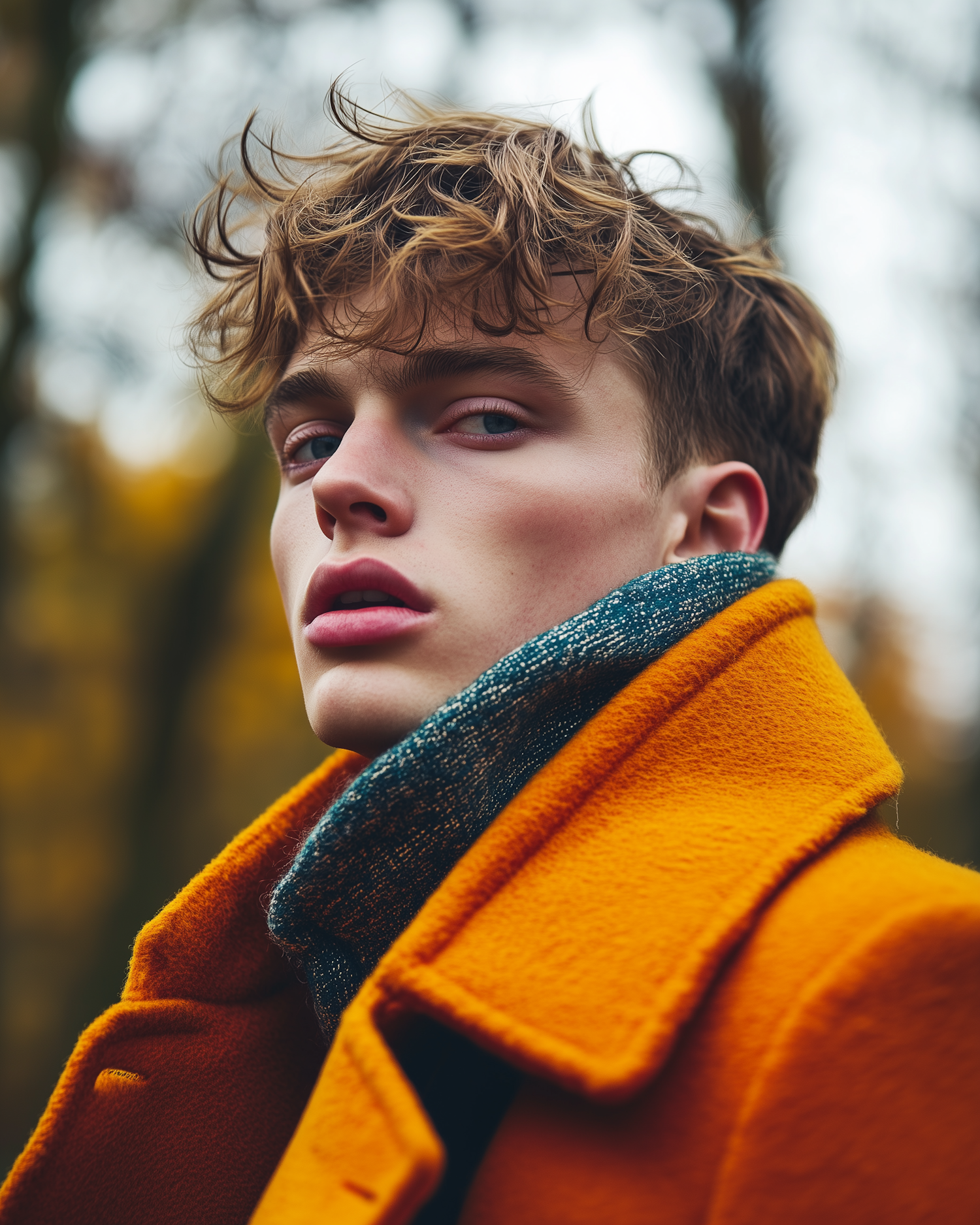 Stylish young man in an orange coat and blue scarf, set against a blurred autumnal background, exuding a pensive and fashionable vibe.