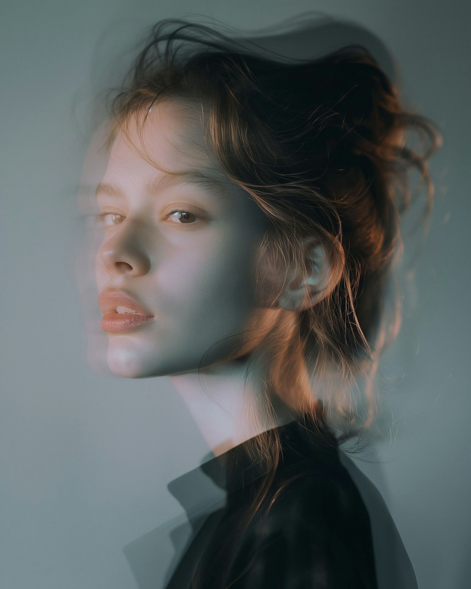 Ethereal portrait of a young woman with double exposure effect, creating a dreamy and artistic visual with soft green background.