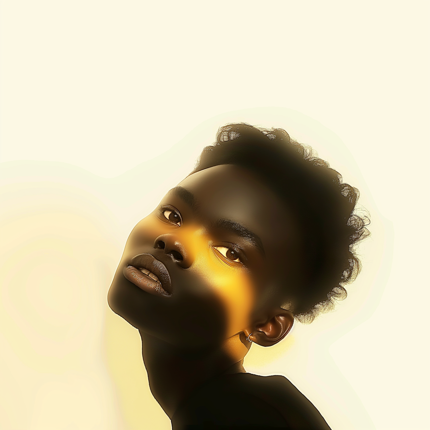 Artistic portrait of a Black individual with dramatic lighting and a warm, golden glow on a pale yellow background.