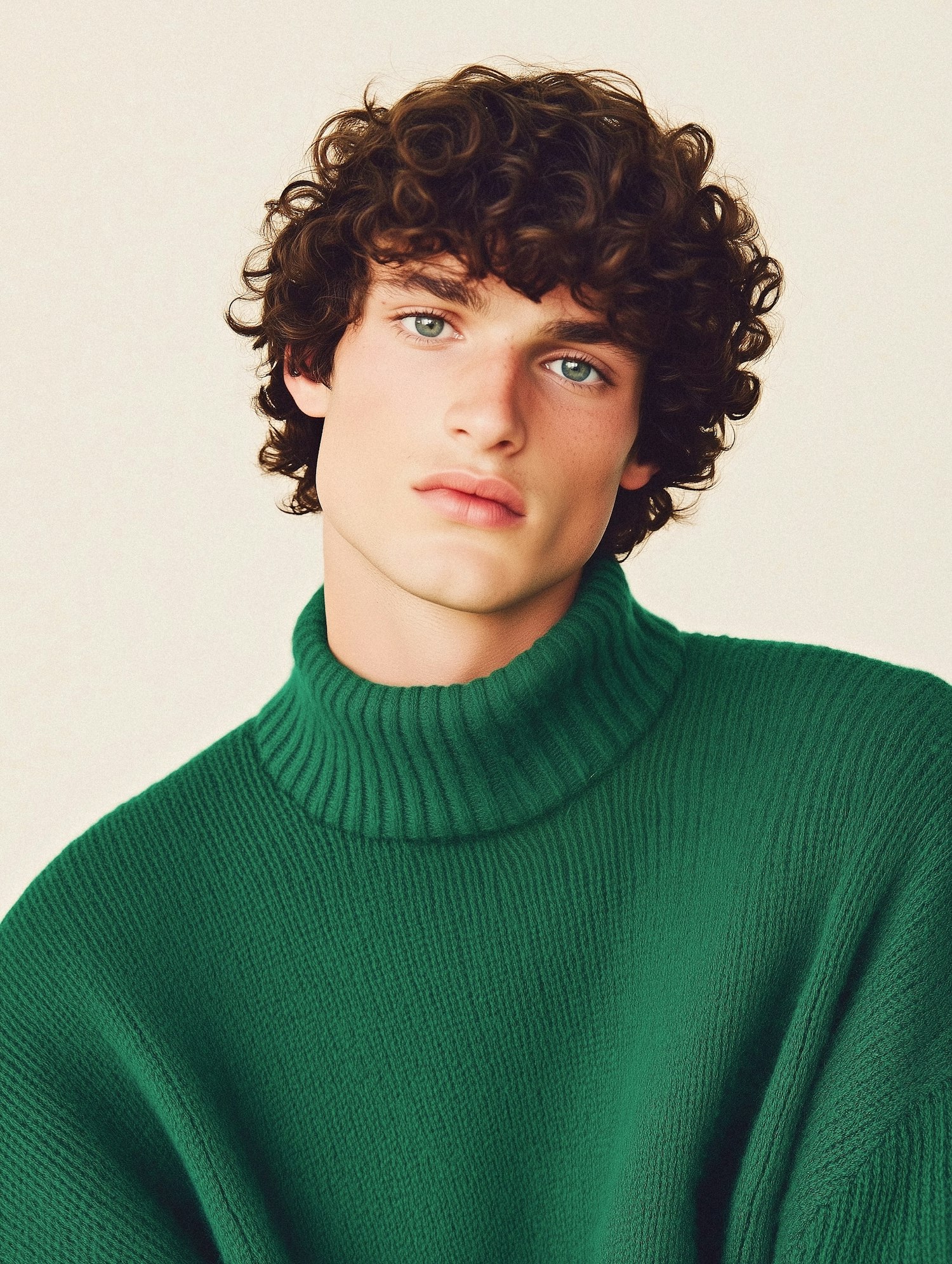 Young man with curly hair in a green turtleneck sweater, gazing pensively against a neutral background.
