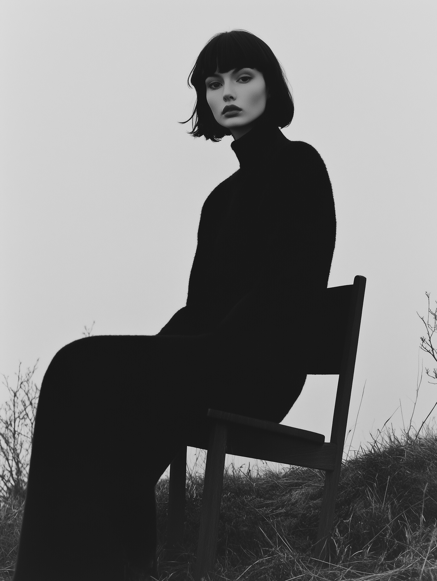 Black and white portrait of a woman with short black hair in a turtleneck dress, sitting on a chair outdoors.