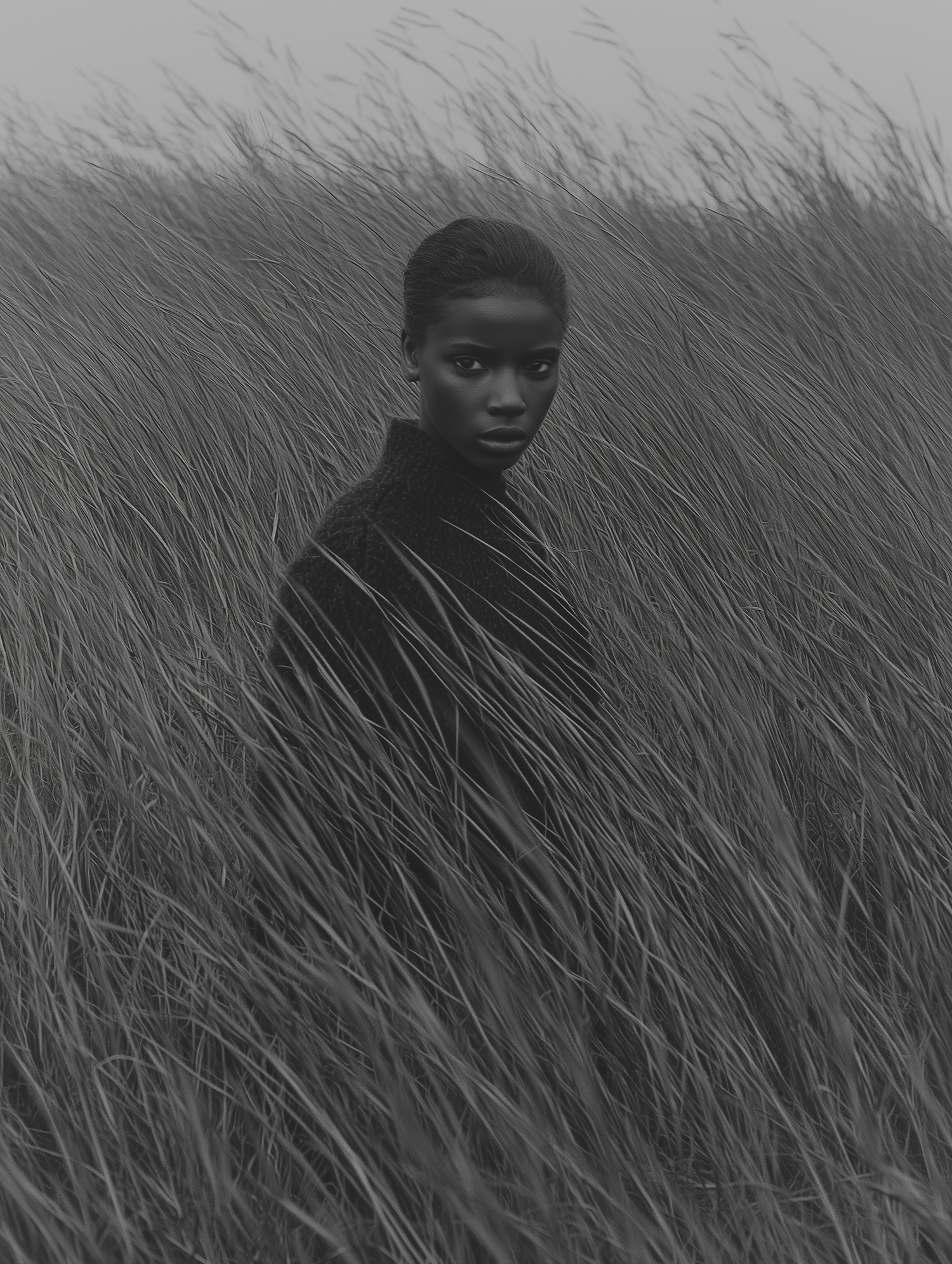 A woman in a dark sweater stands in tall grass, her serious expression framed by the monochromatic tones of the scene.