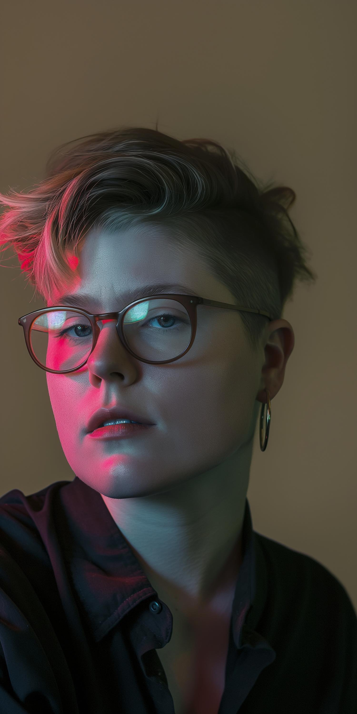 Portrait of a person with short hair and glasses, highlighted by pink and green lighting, wearing a dark shirt and hoop earring.