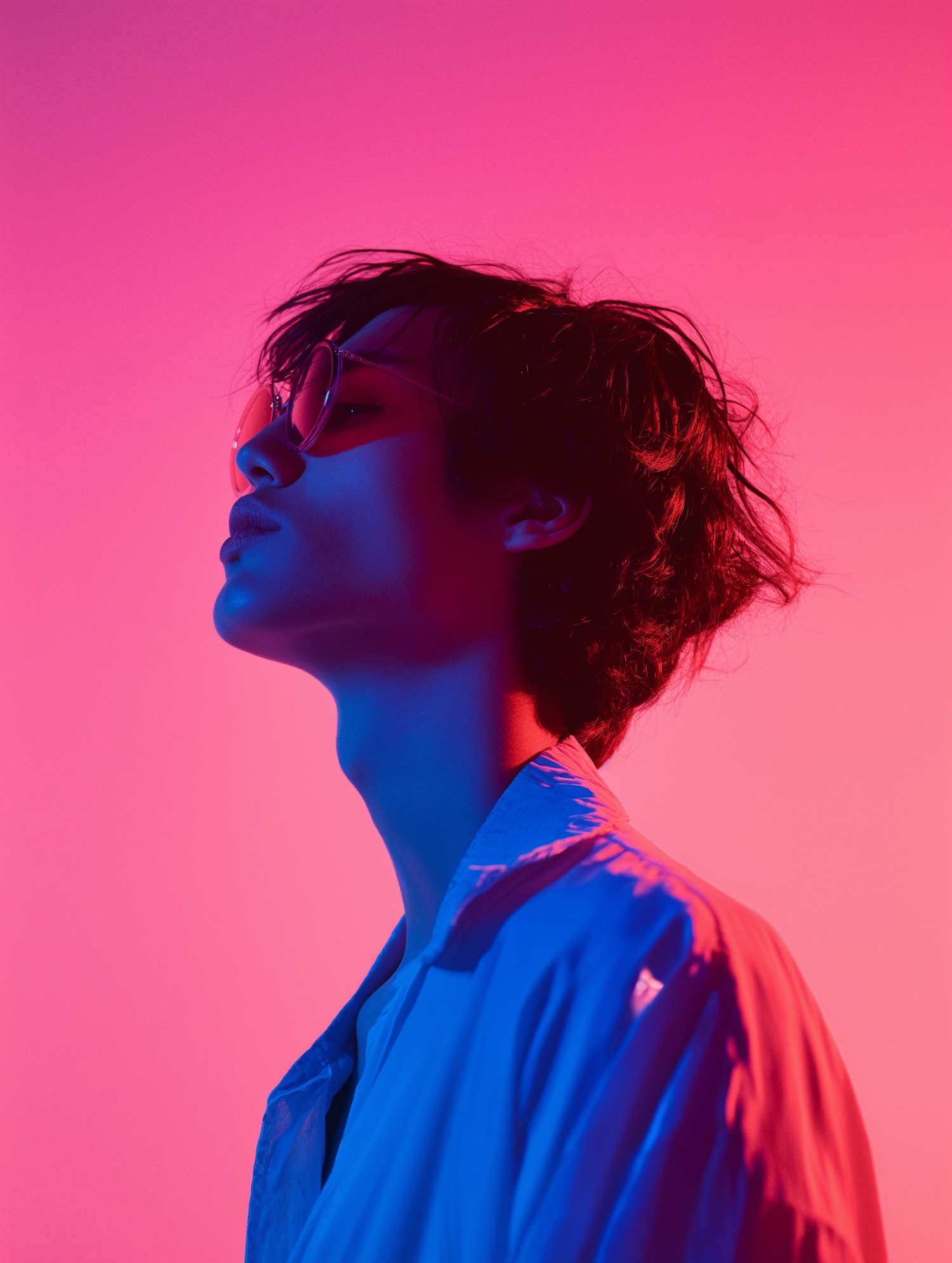 Stylish side profile portrait with vibrant pink and blue lighting, featuring sunglasses and a white shirt for a modern, artistic look.