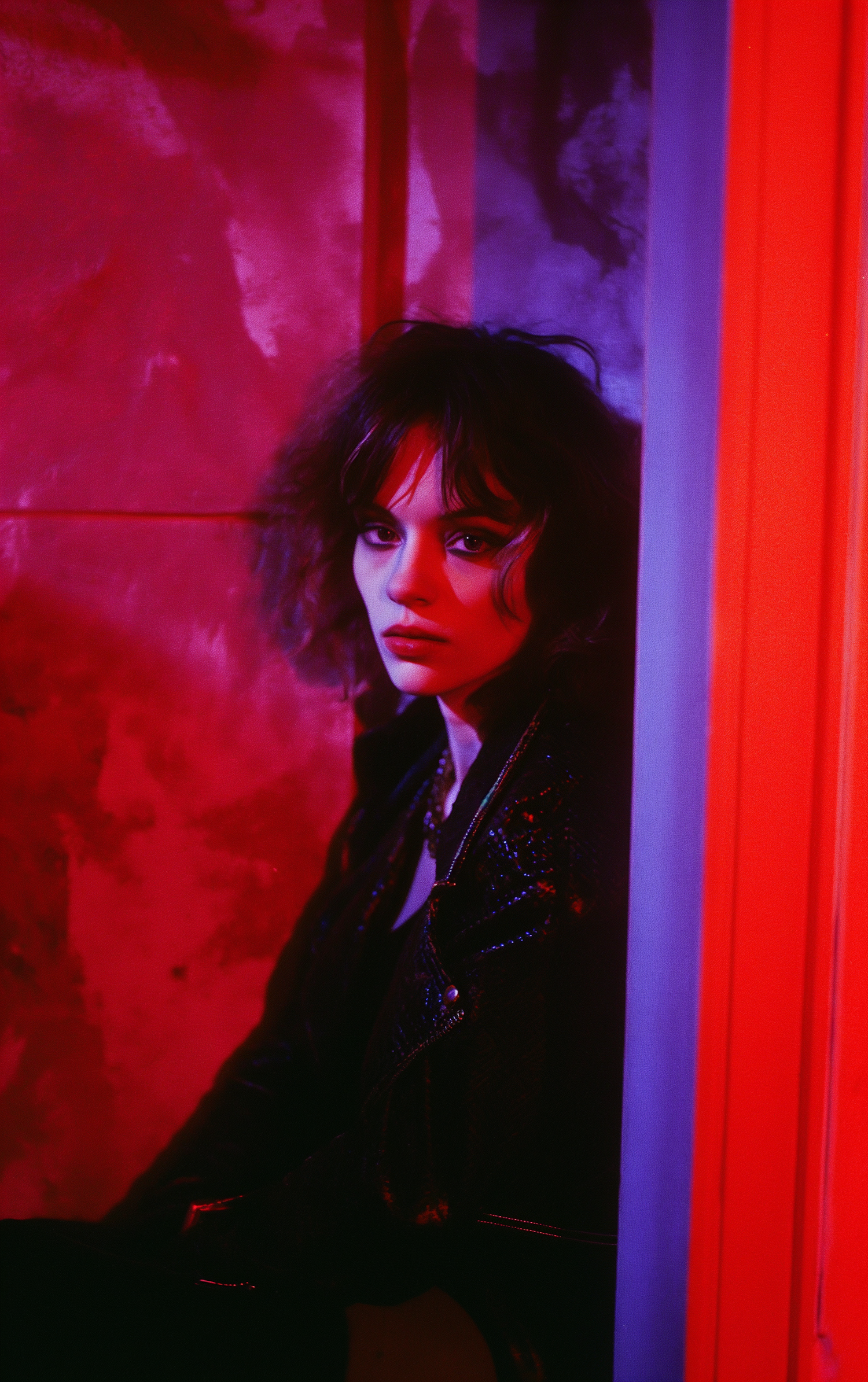Moody portrait of a young woman in dramatic red and purple lighting, wearing a black jacket with a serious expression.