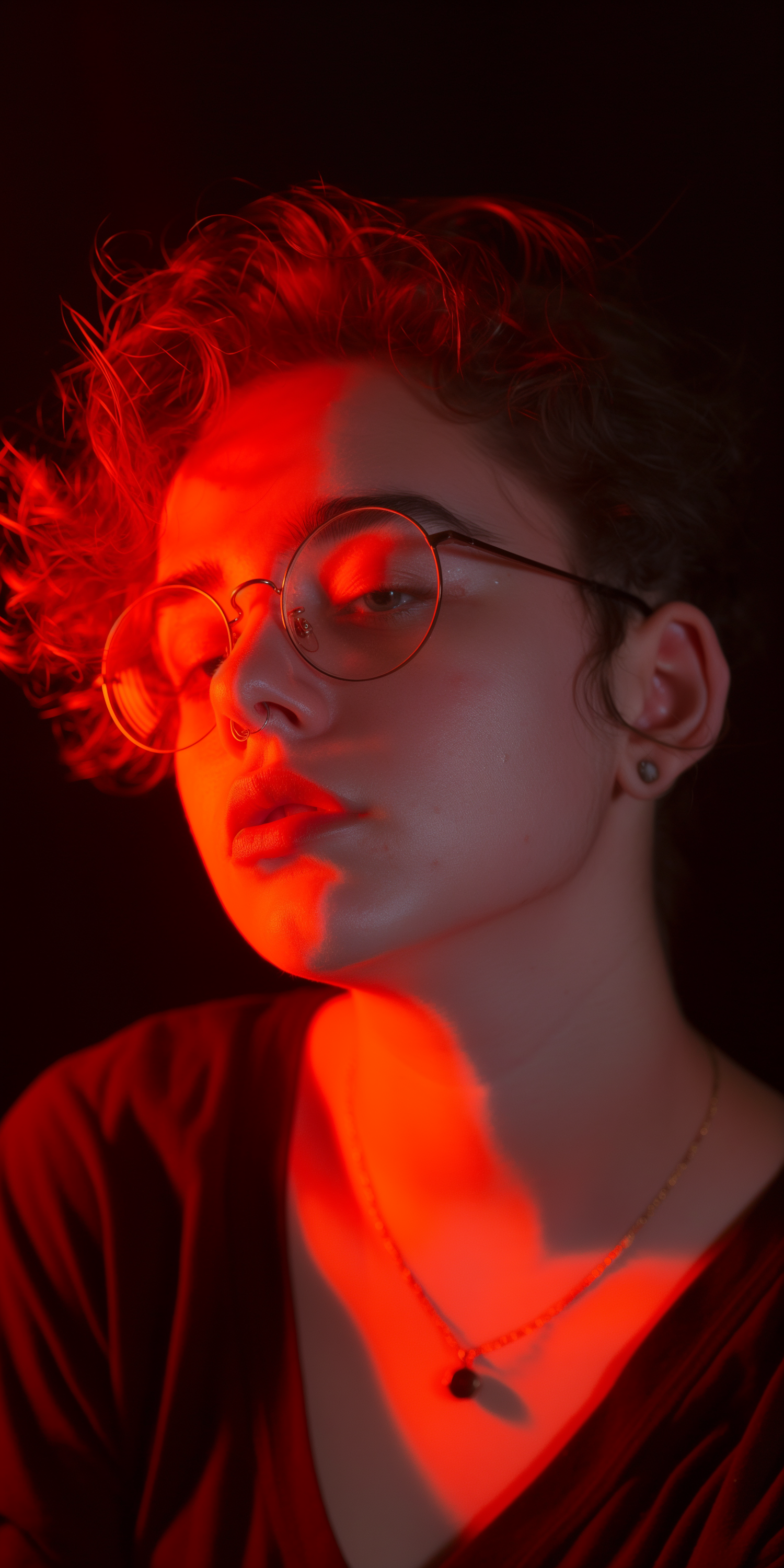Portrait of a person with glasses and red lighting, creating dramatic shadows and highlighting facial features against a dark background.