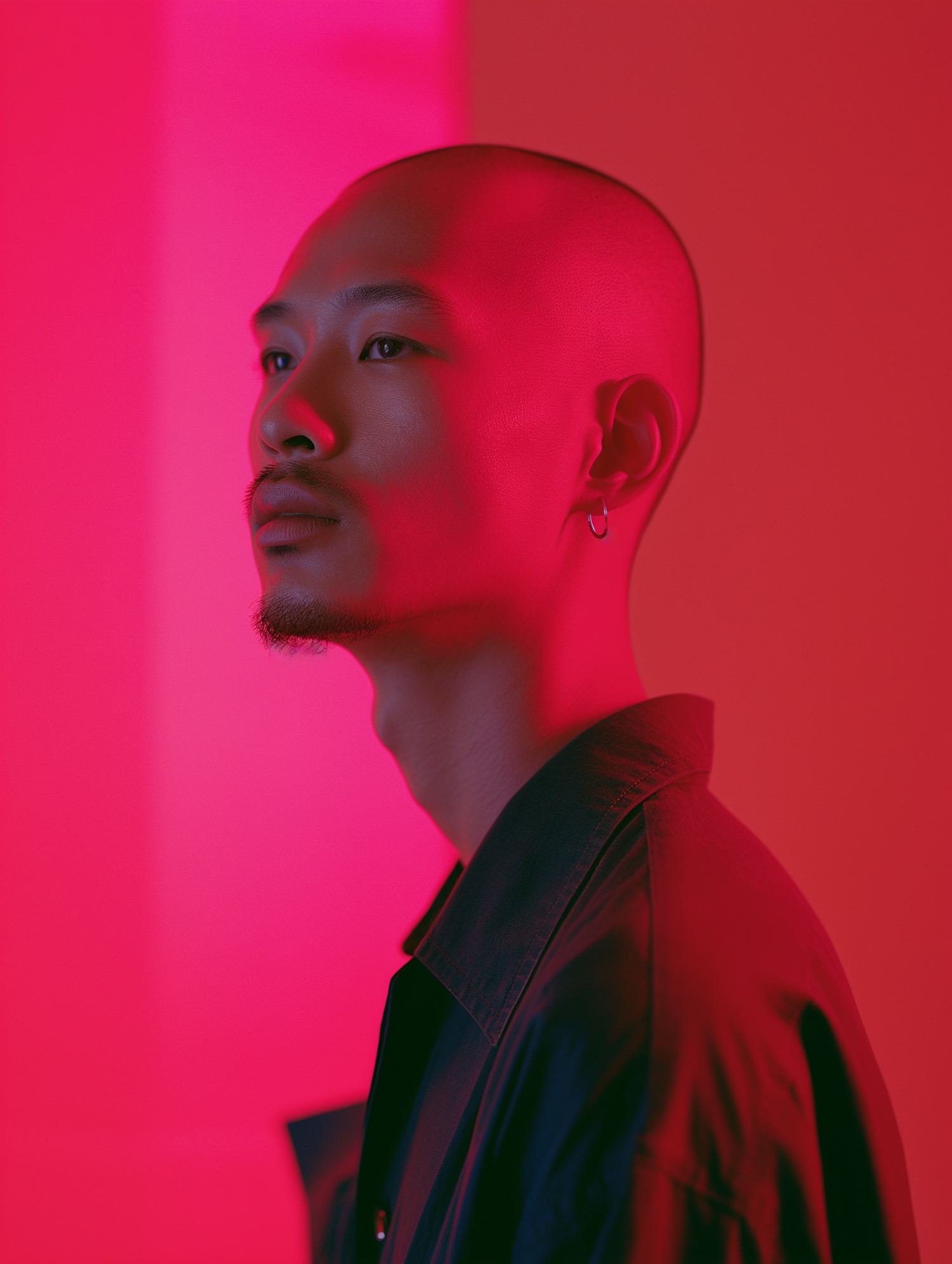 Artistic portrait of a man with shaved head, goatee, and hoop earring, illuminated by vibrant red and pink lighting.