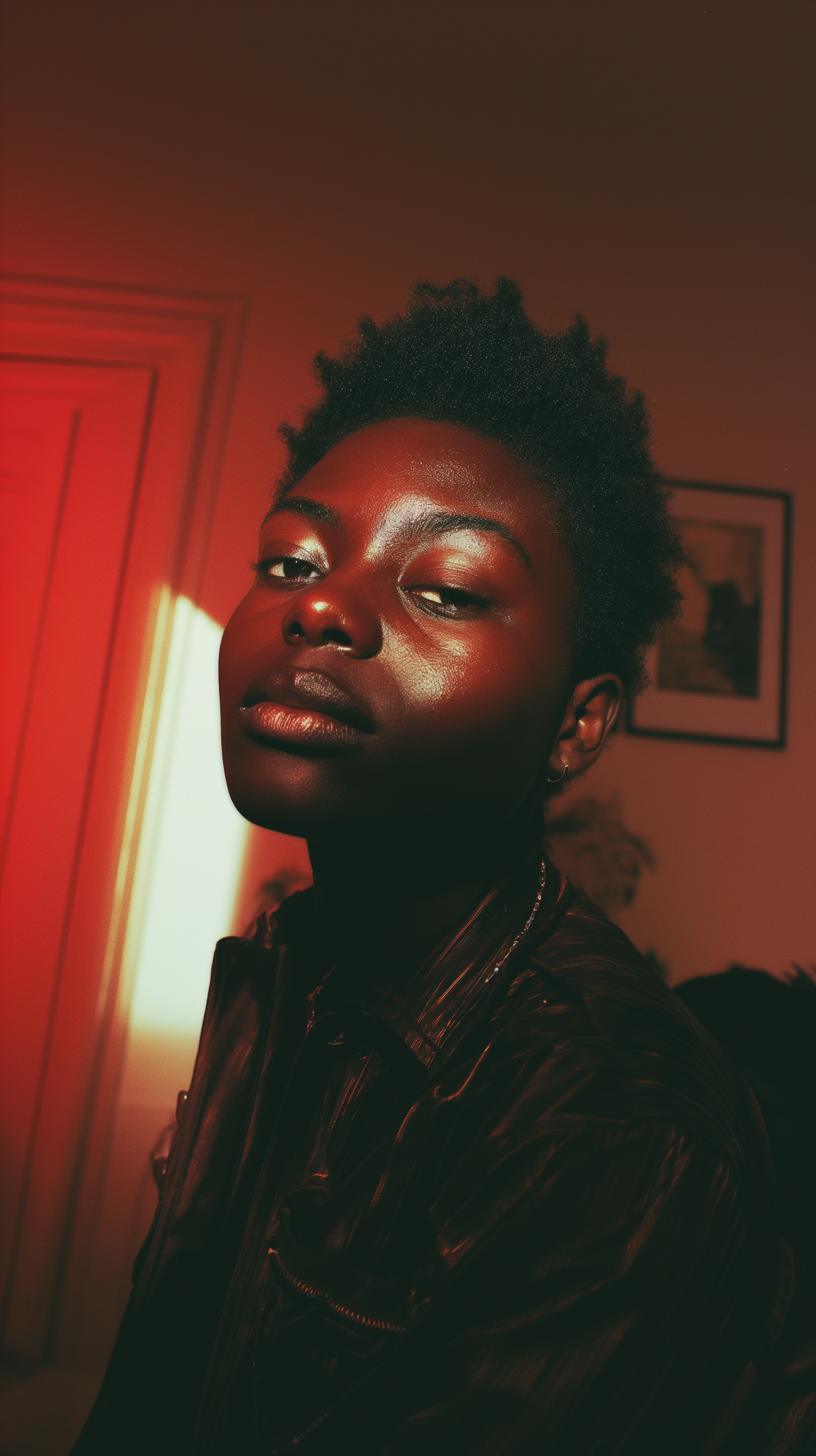Dramatic portrait of a Black individual with bold red lighting, natural afro-textured hair, and a confident expression.