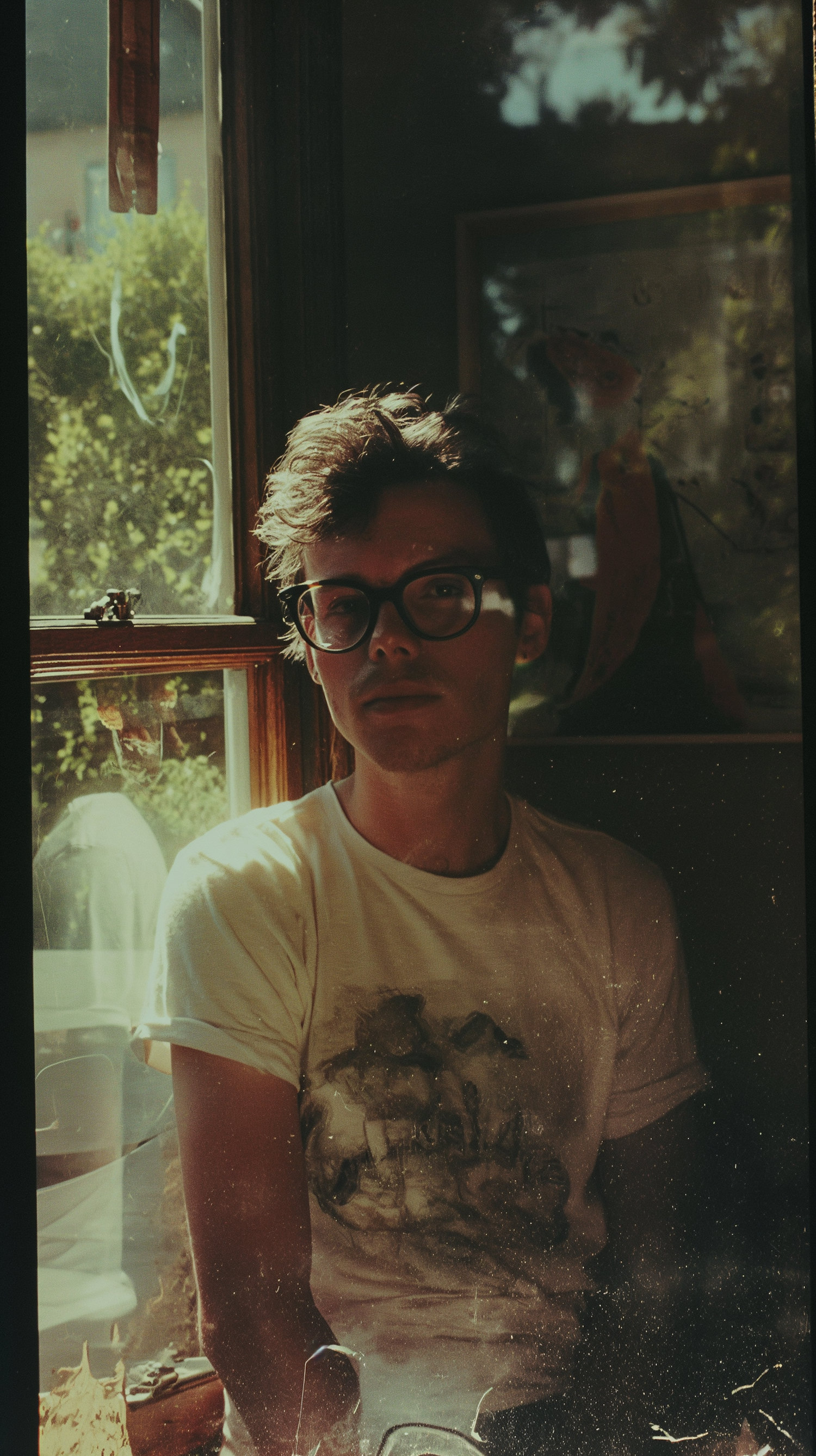 Young man with glasses in warm sunlight by a window, wearing a white graphic tee. Nostalgic and relaxed atmosphere.