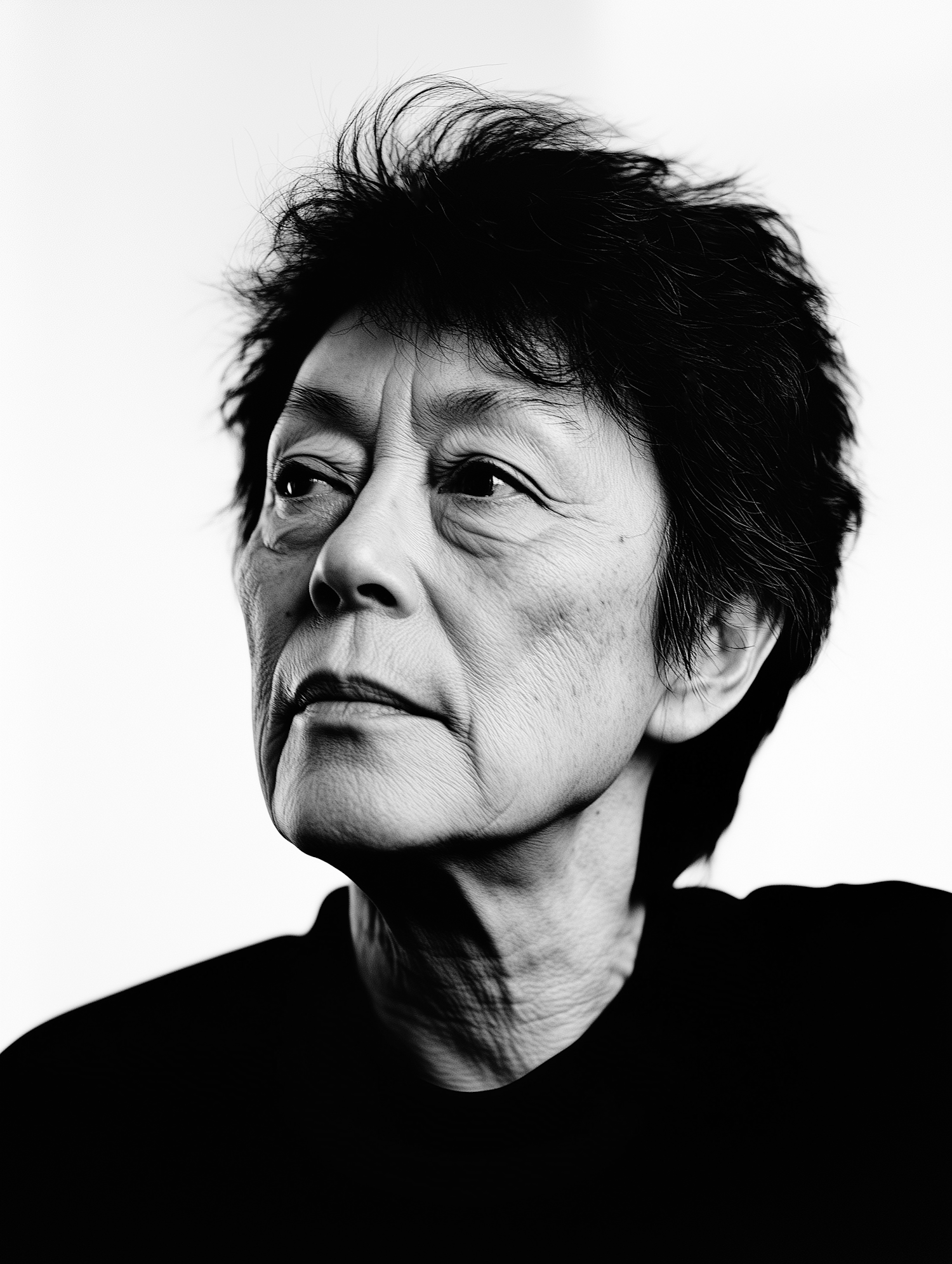 Black and white portrait of an older Asian woman with short hair, showing a contemplative expression against a plain background.