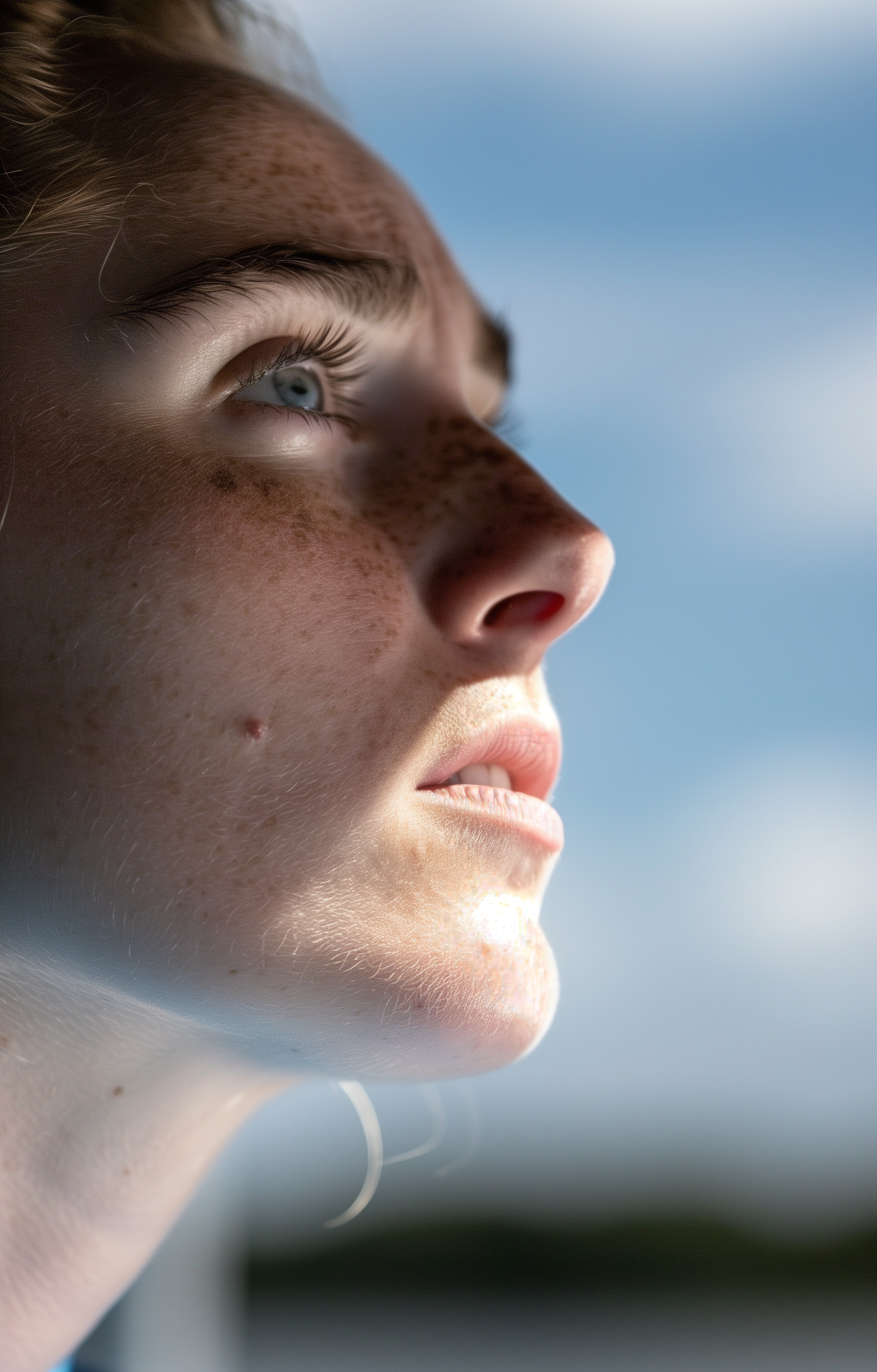 Close-up of a freckled face gazing upward, with sunlight highlighting features against a blurred blue sky background.
