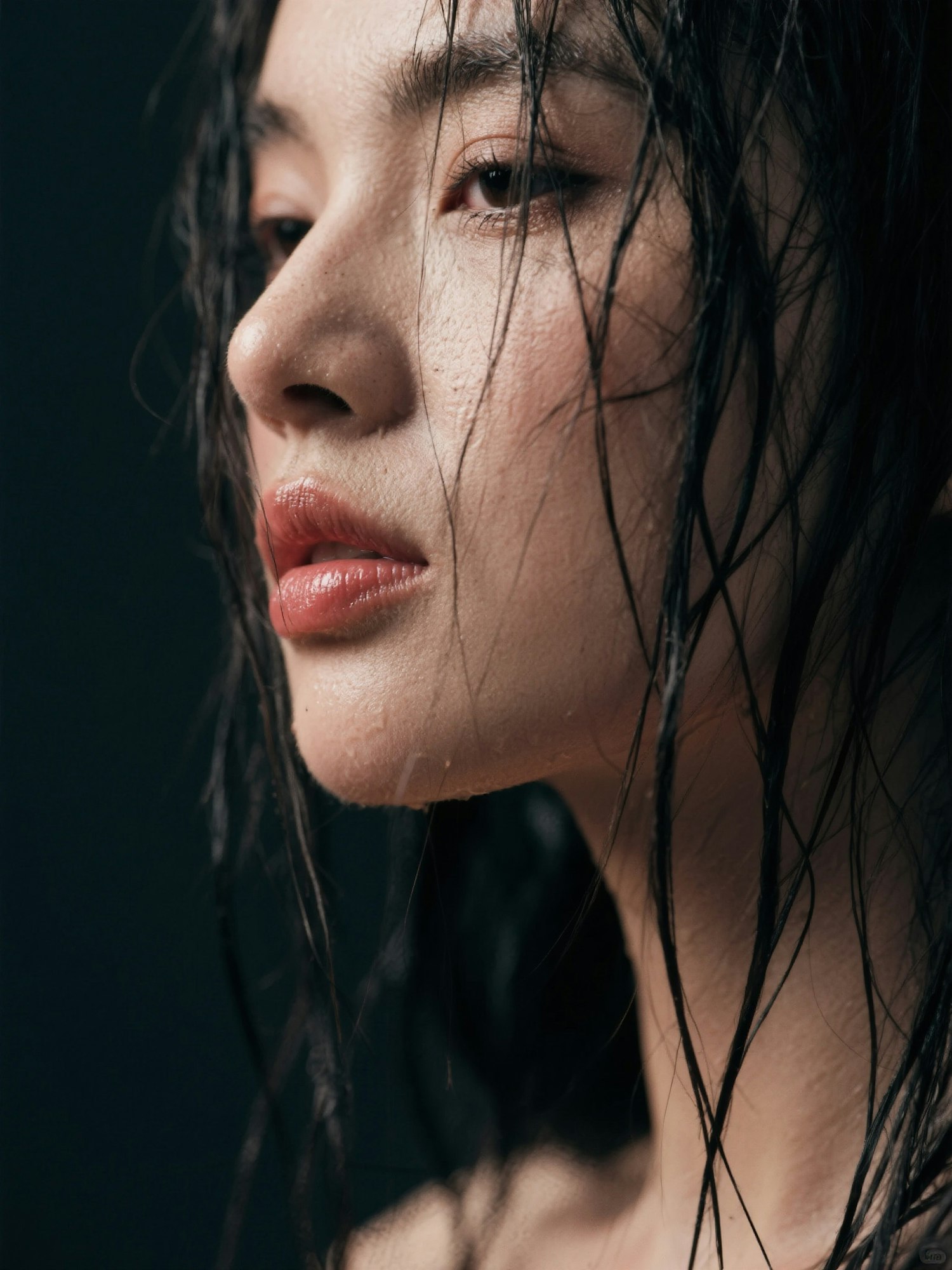Close-up of a person with wet hair and natural makeup, showcasing a dramatic and artistic portrait with a dark background.
