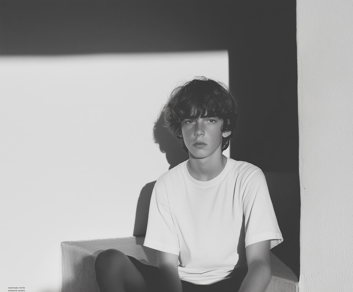 Young boy with curly hair in white t-shirt sits in shadowy light, creating a striking contrast on a minimalistic background.