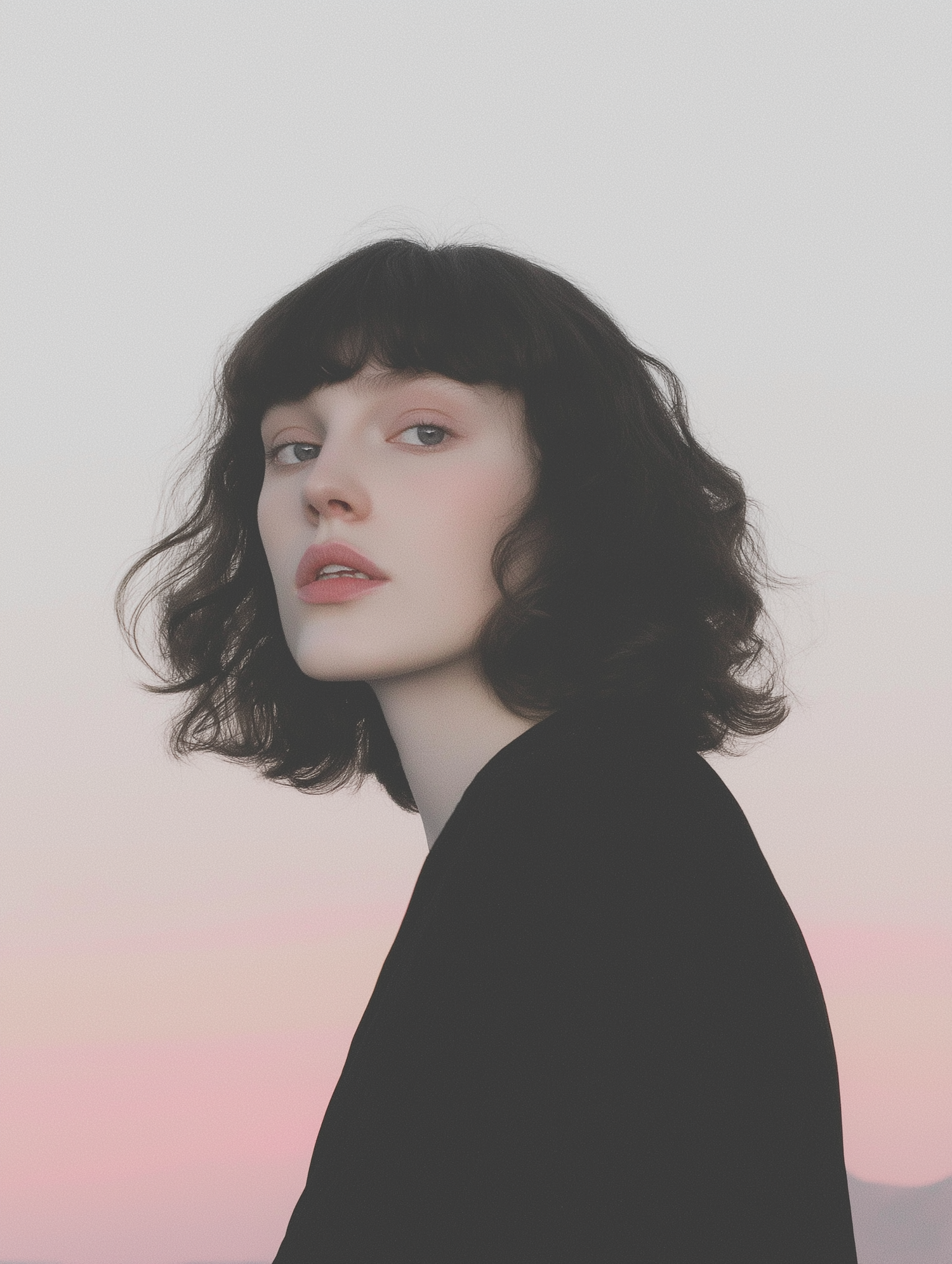 Portrait of a young woman with wavy black hair against a pastel sunset sky, exuding a serene and contemplative mood.
