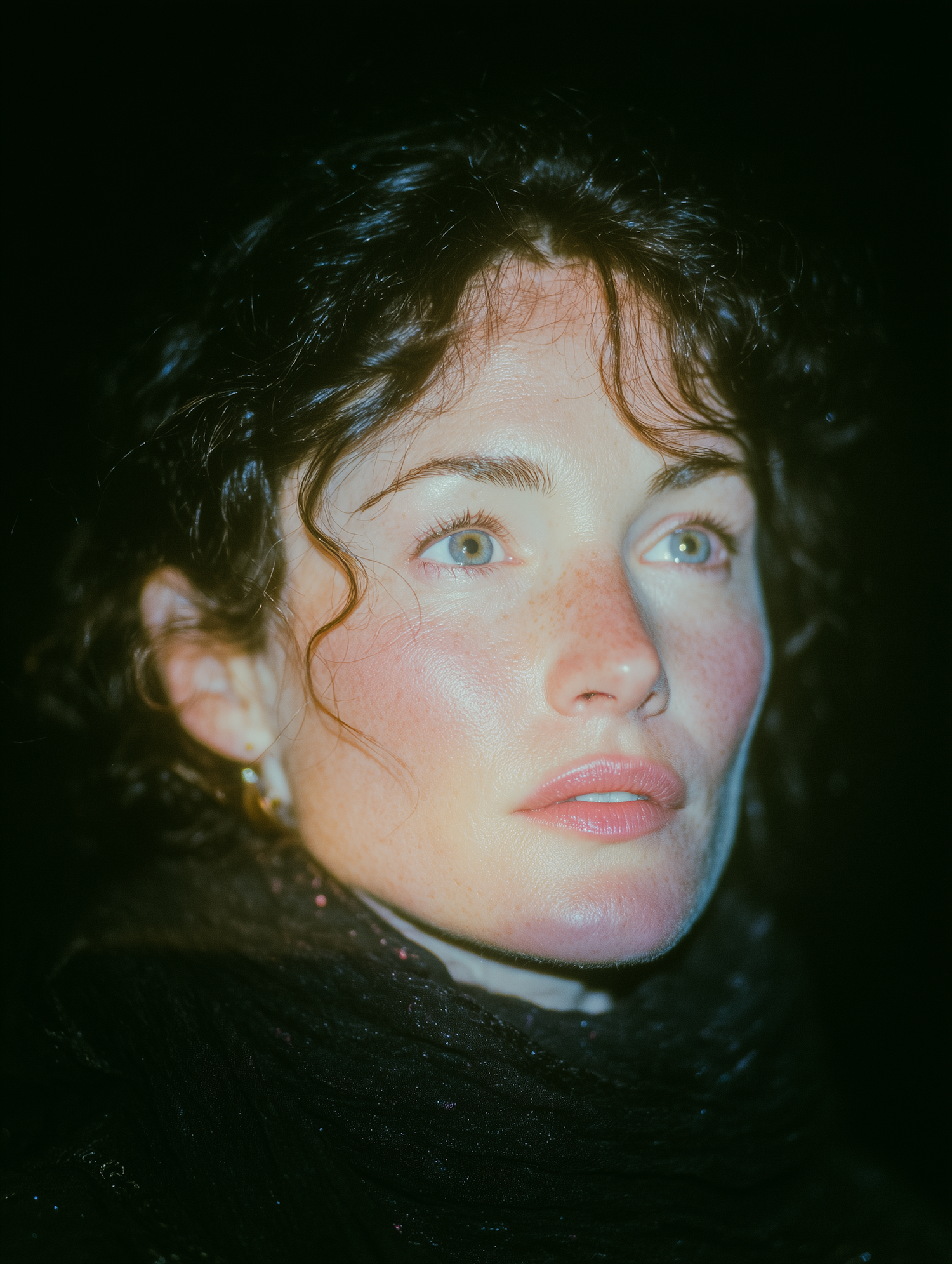 Close-up portrait of a person with curly dark hair and green eyes, illuminated against a dark background, wearing a dark scarf.