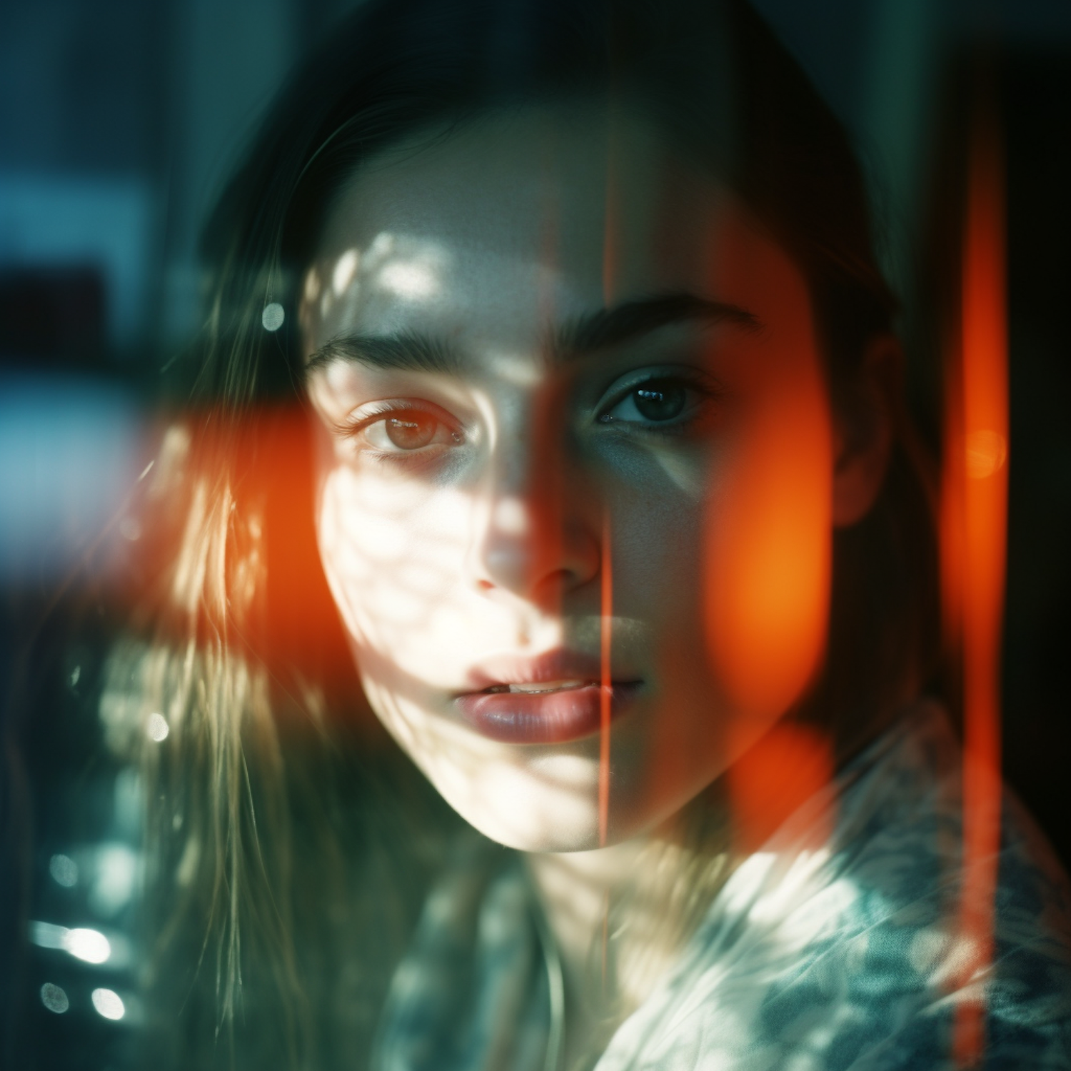 A young woman with dramatic lighting and shadows on her face, creating an artistic and contemplative mood.