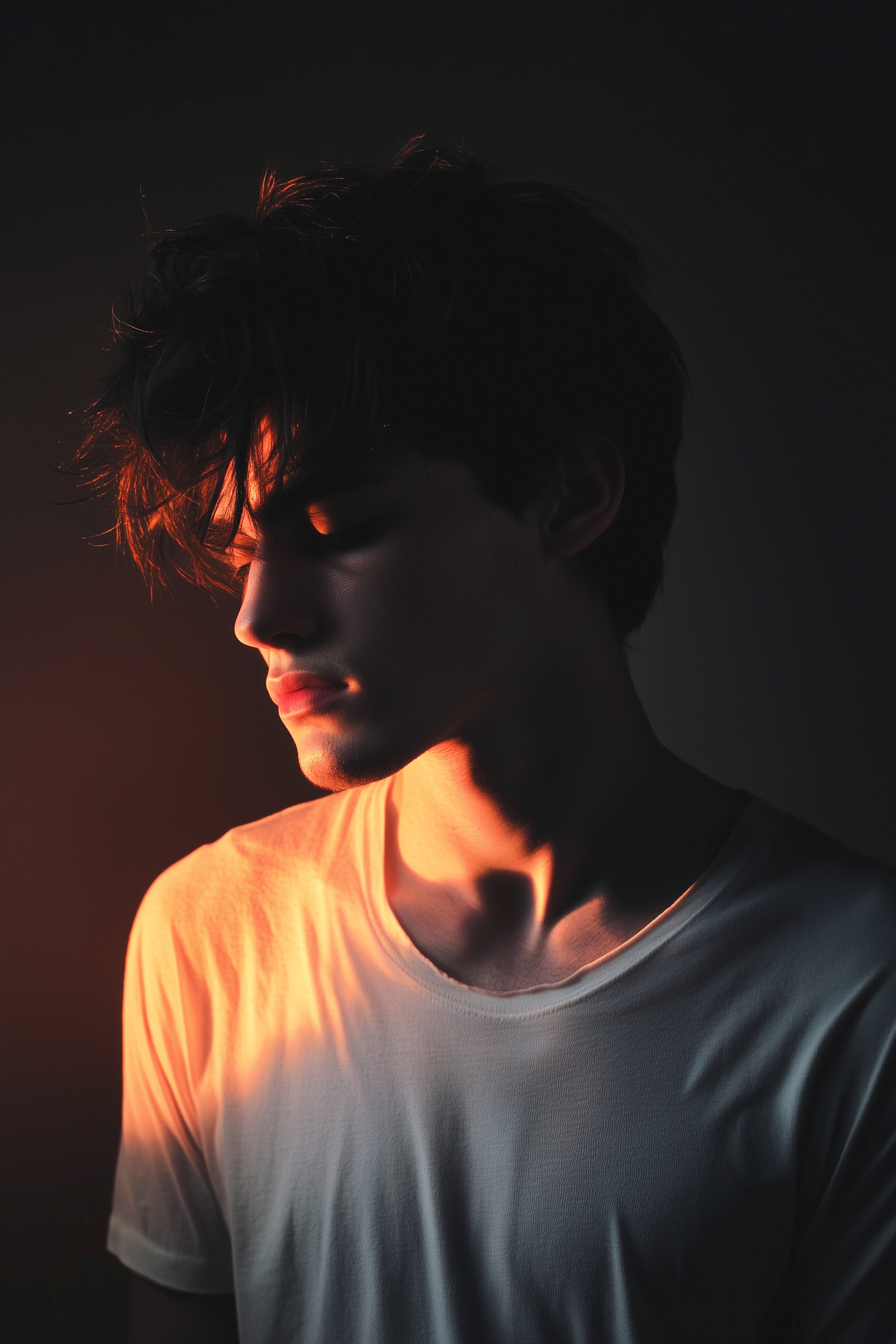 Dramatic portrait of a young man with warm lighting, highlighting his serene expression and tousled hair against a dark background.