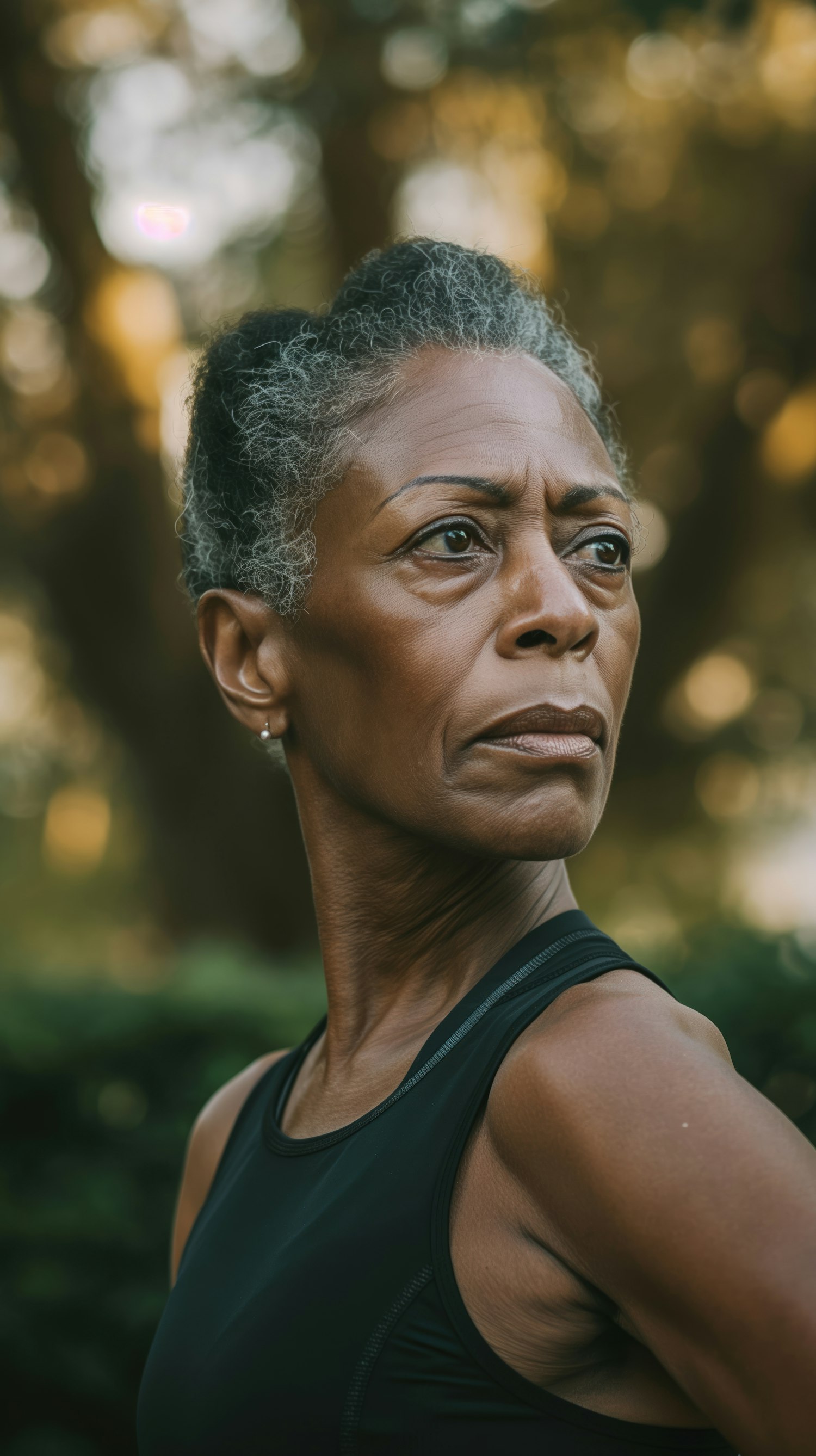 Portrait of a determined older Black woman in a black athletic top, set against a blurred natural background.
