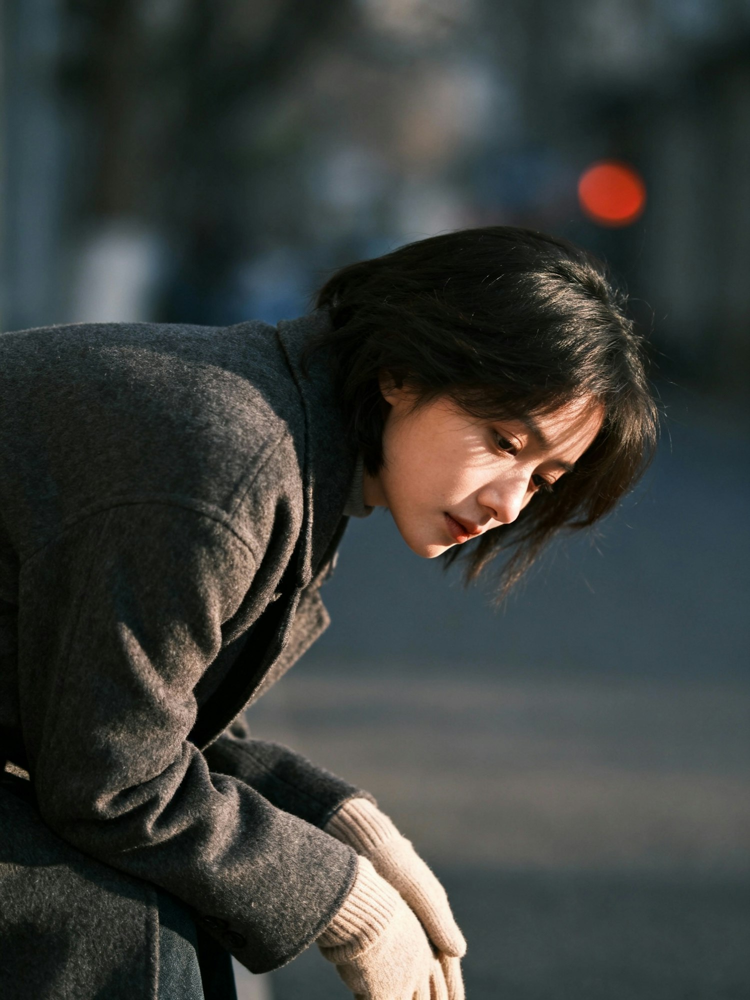 A person in a gray coat and gloves sits thoughtfully in soft lighting, with a blurred urban background and a red light in the distance.