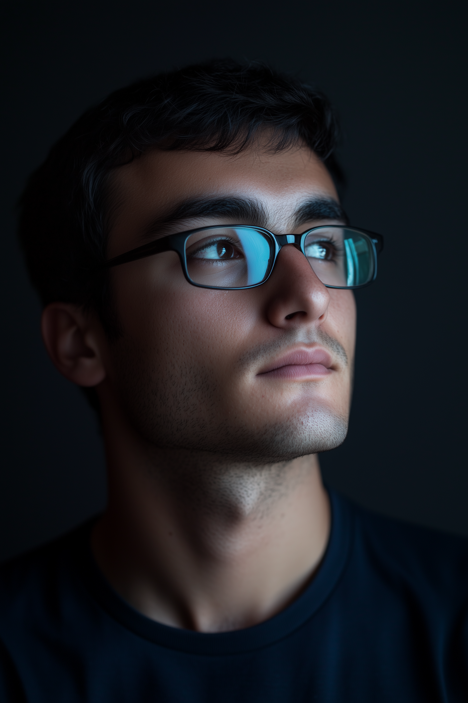 Young man with glasses gazing upward in a contemplative pose against a dark background, soft lighting highlights his features.