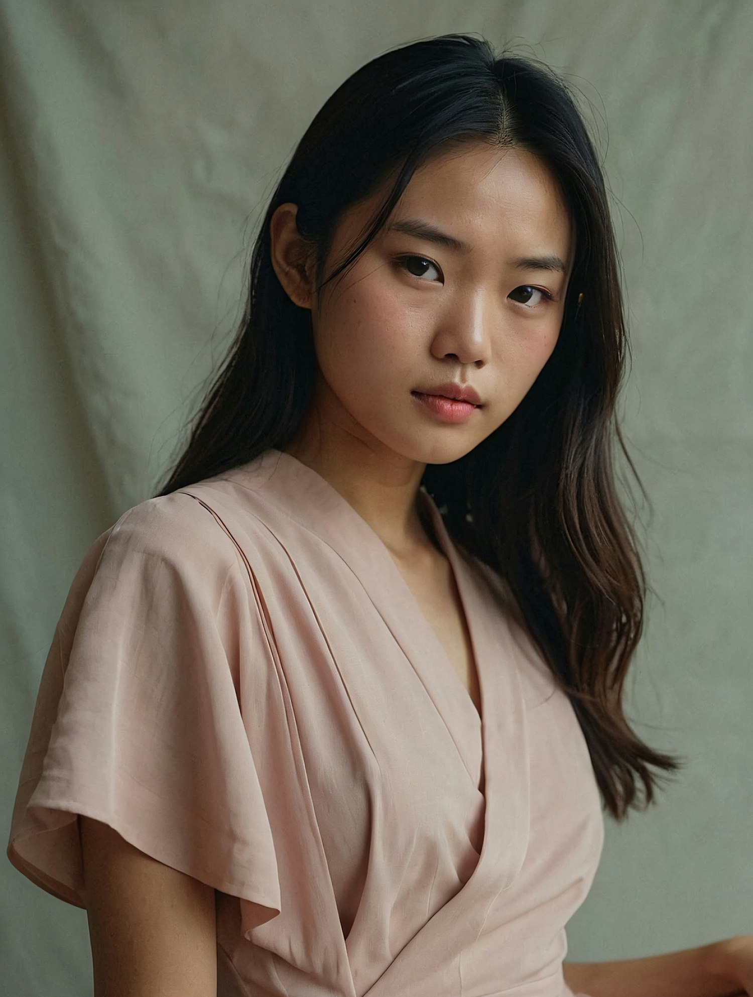 Portrait of an Asian woman in a light pink dress, with long dark hair and a calm expression, set against a neutral background.