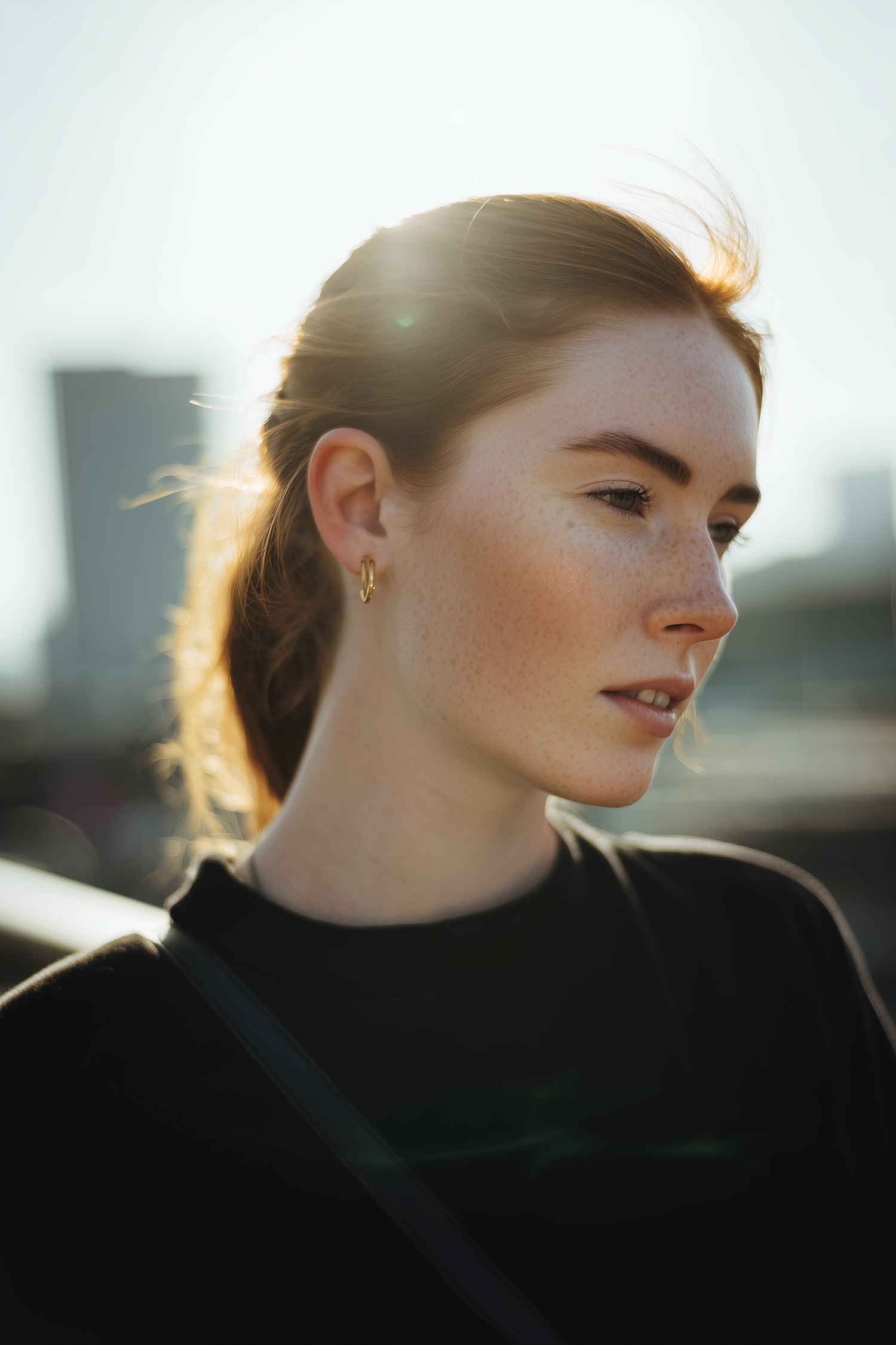 Close-up of a young woman with freckles and auburn hair in soft sunlight, wearing a black top and gold hoop earrings.