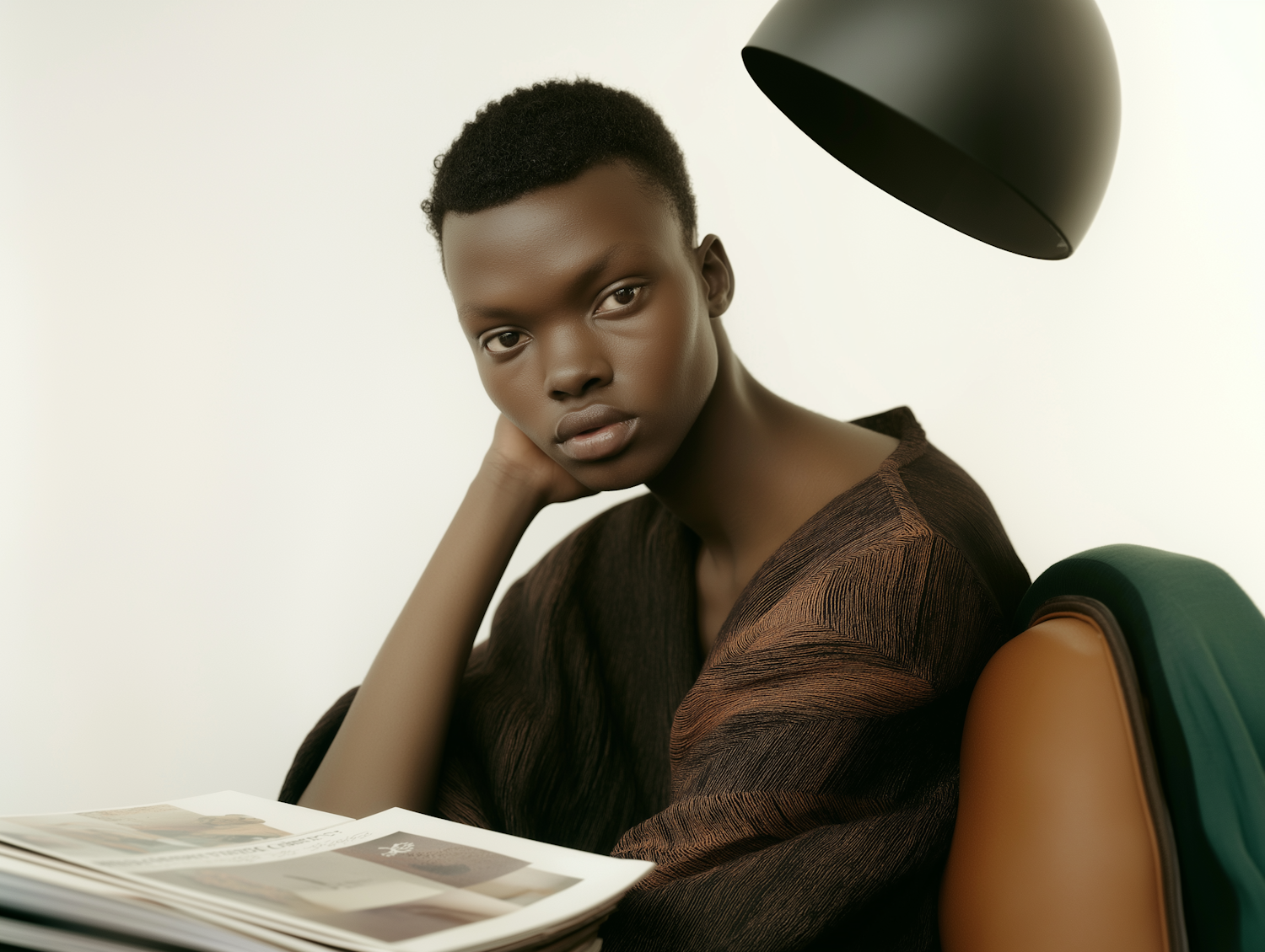 Young Black woman in a brown top, seated with a magazine, under a modern lamp. Calm expression, short curly hair, serene setting.