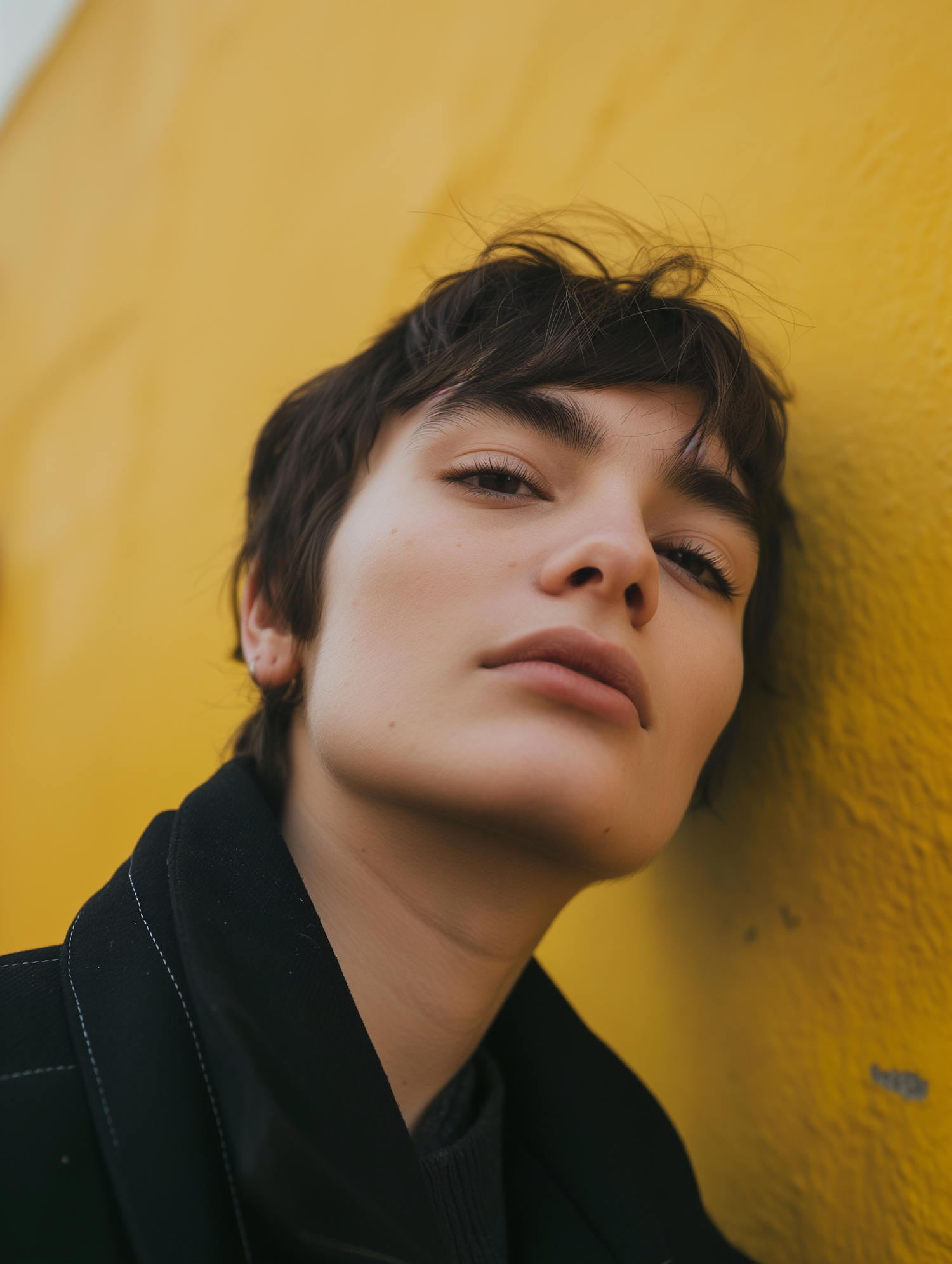Close-up portrait of a person with short dark hair against a vibrant yellow wall, wearing a dark coat.