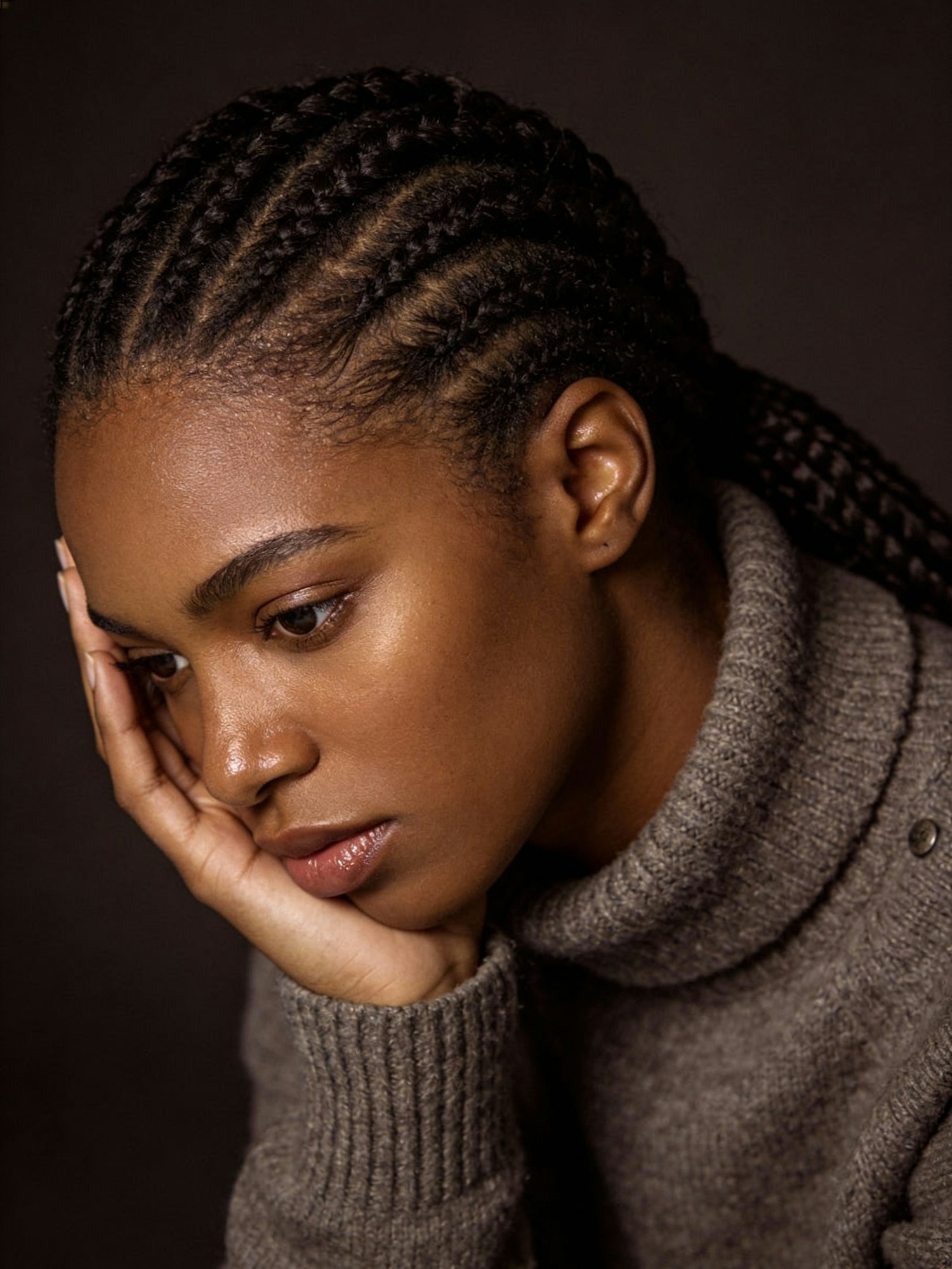 A Black woman with deep brown skin and long, neatly braided hair rests her face gently on her hand in a contemplative pose. Her expression is serene and introspective, evoking quiet strength and emotional depth. She wears a soft, charcoal knit turtleneck sweater—minimalist and textured—whose tone echoes the background while adding warmth and tactile richness. The lighting is dramatic and directional, casting soft highlights across her skin and accentuating its smooth texture and natural sheen. She is framed against a plain, dark background—charcoal or deep espresso brown—to create visual contrast and draw focus to her features. The composition is intimate and minimalist, emphasizing mood, gesture, and the quiet power of presence. Hyperrealistic rendering should highlight skin texture, braid detail, knit fabric, and the interplay of light and shadow with emotional clarity and visual precision.