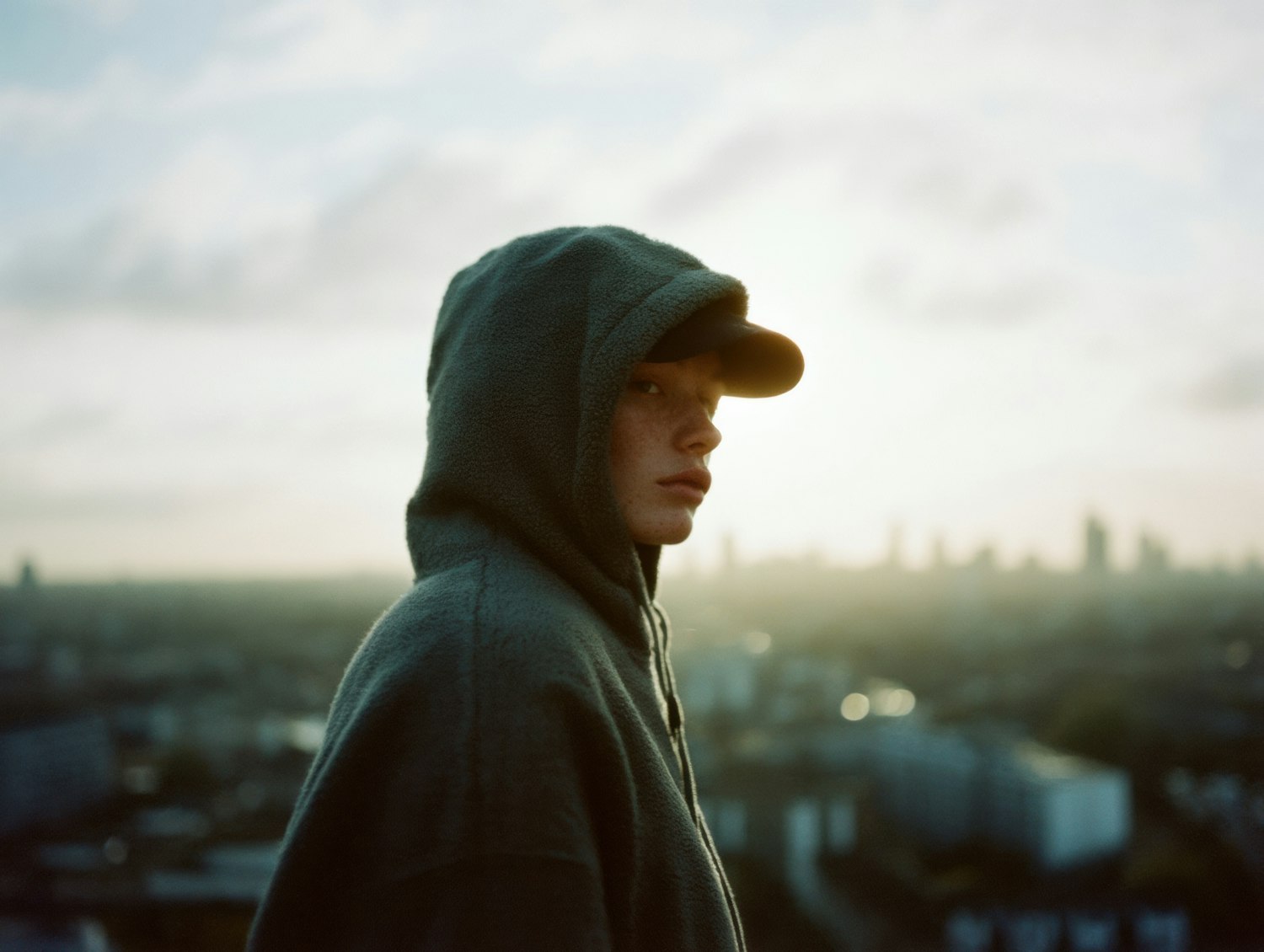 A moody portrait of a freckled individual in a hoodie and cap, set against a blurred cityscape during golden hour.