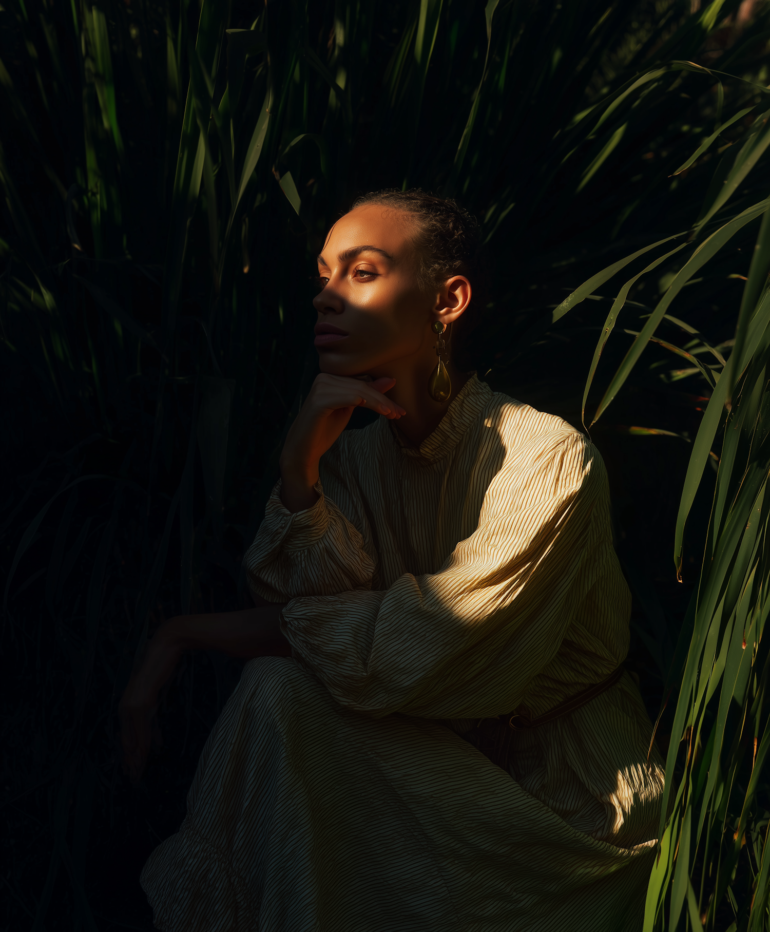 A serene portrait of a person in nature, with sunlight highlighting their face amidst lush green foliage.