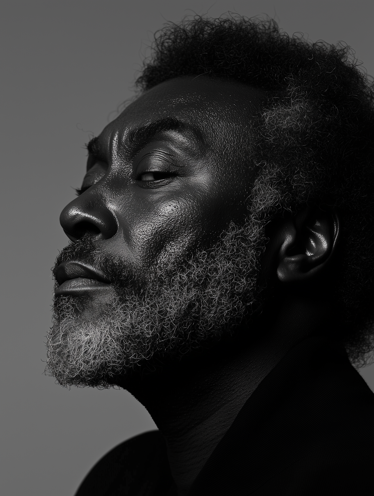 Black and white portrait of an older Black man with a gray beard, looking upwards with a confident expression.