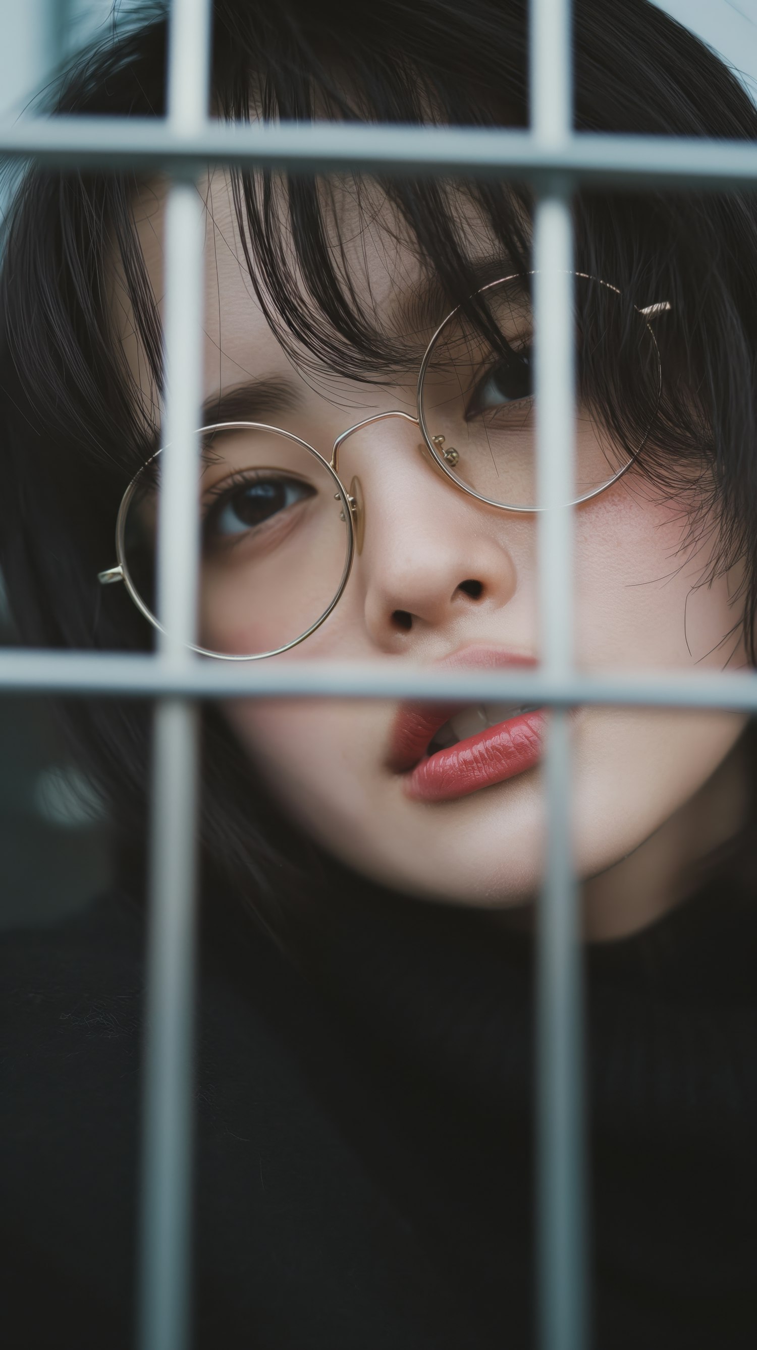 Close-up of a woman with round glasses and red lips, framed by metal bars, creating a moody and artistic vibe.