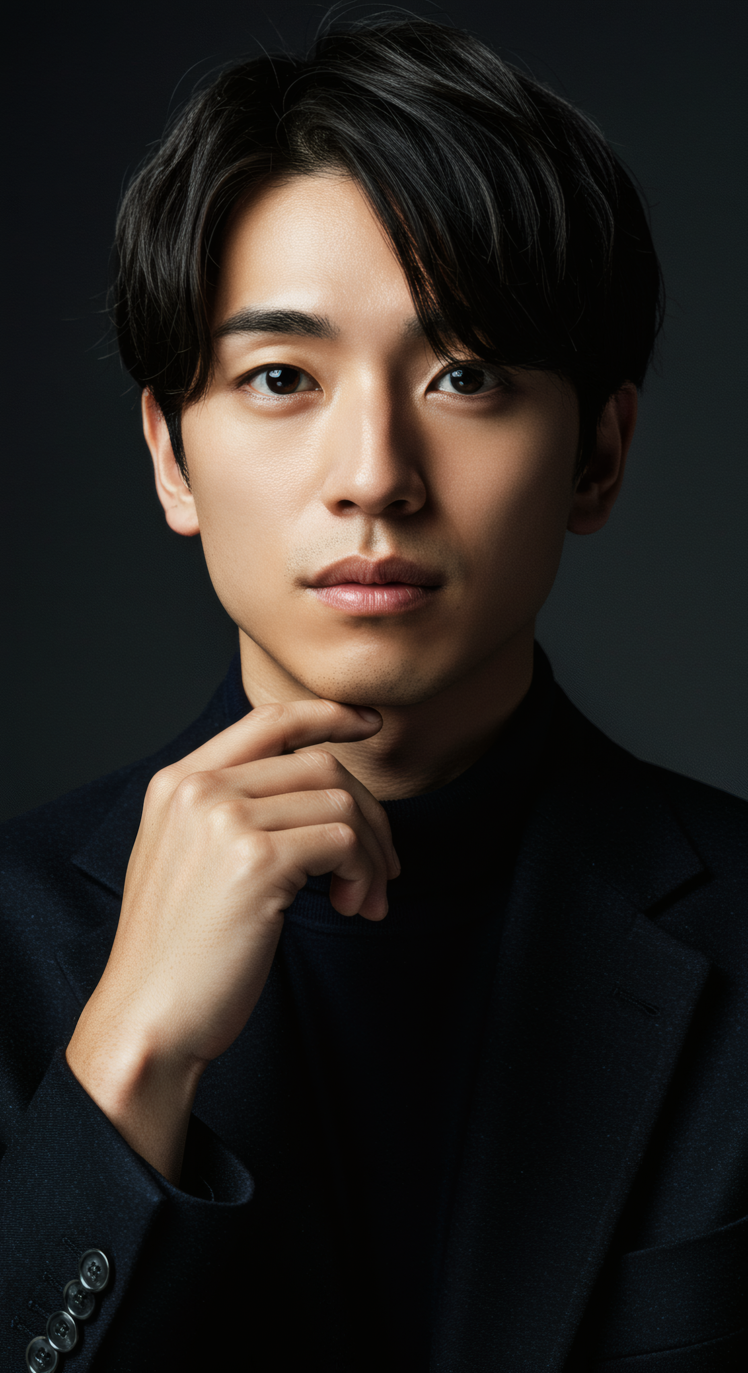 Portrait of a young Asian man in a dark suit, looking thoughtful with his hand on his chin against a dark background.