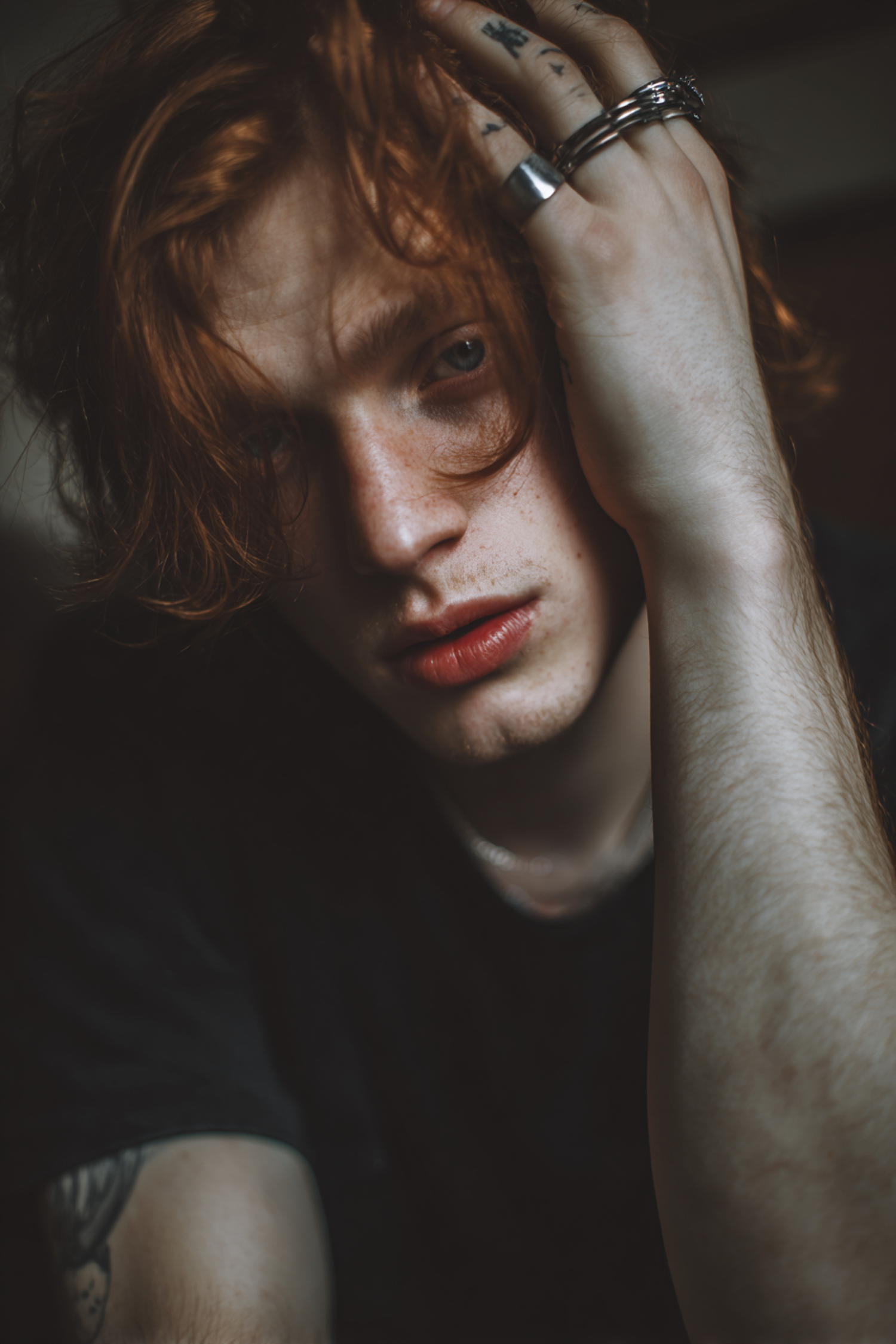 A close-up portrait of a red-haired individual with tattoos and rings, captured in soft, moody lighting.