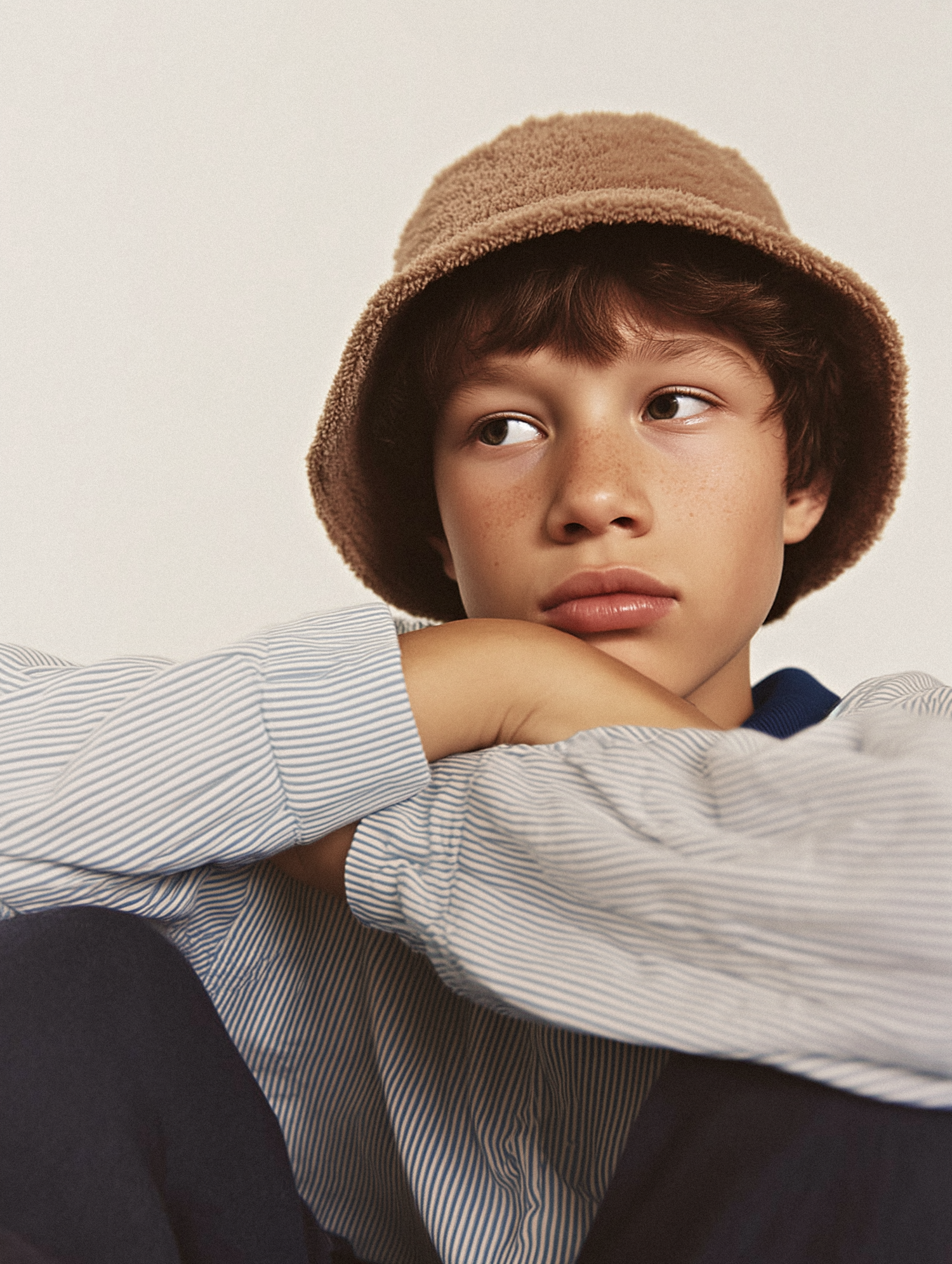 A close-up portrait of a young person in a beige bucket hat and striped shirt, with a thoughtful expression against a neutral background.