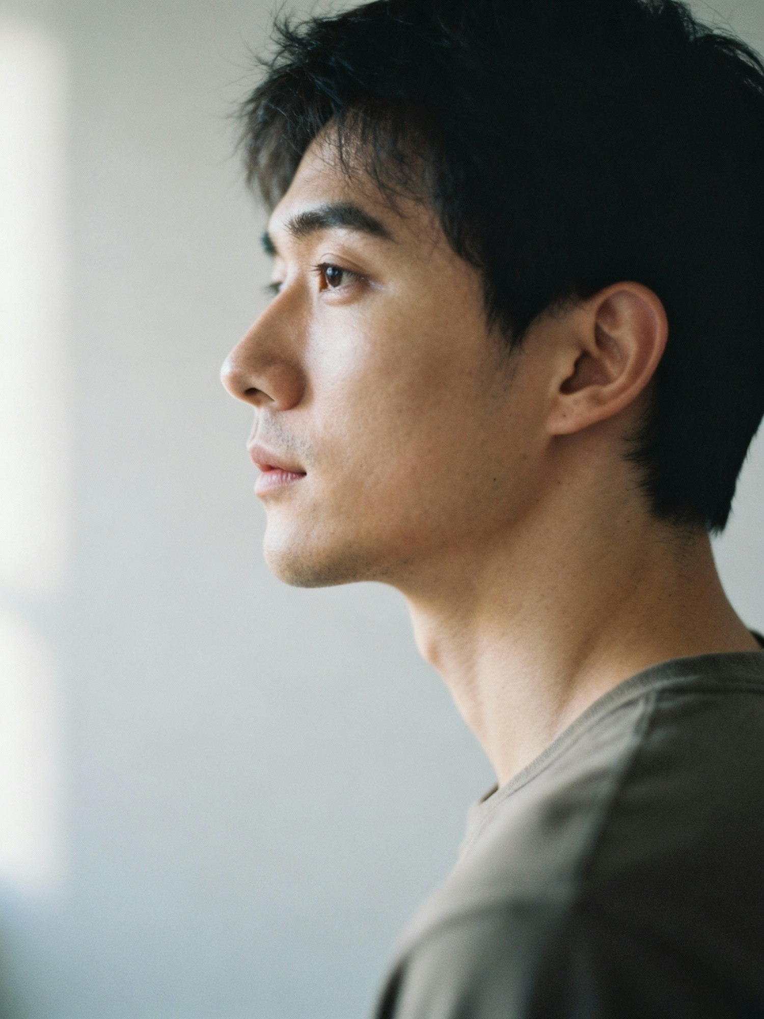 Profile view of a young man with short dark hair, wearing a neutral shirt, in soft natural light against a blurred background.