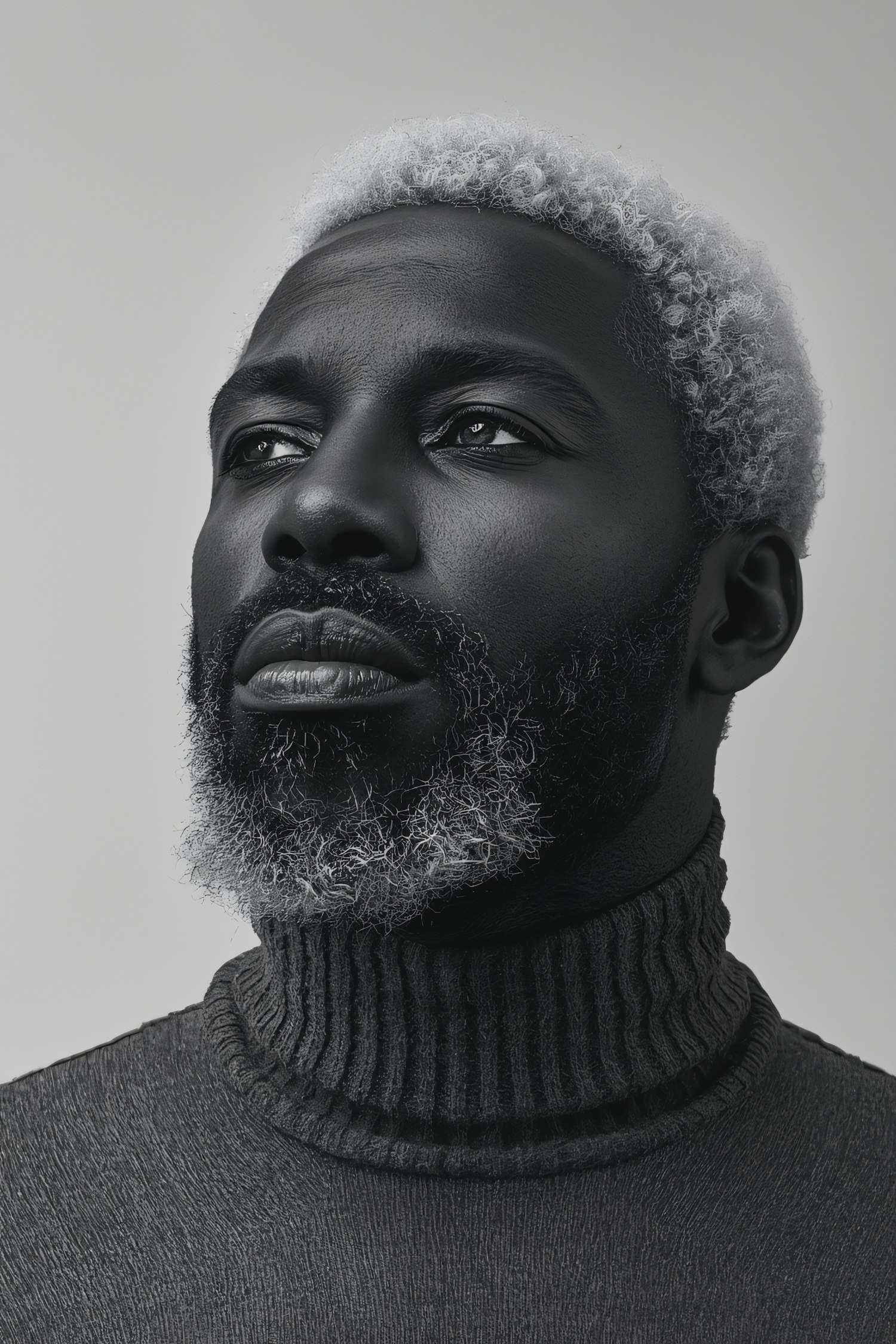 Monochromatic portrait of a man with white hair and beard, wearing a dark turtleneck against a neutral gray background.